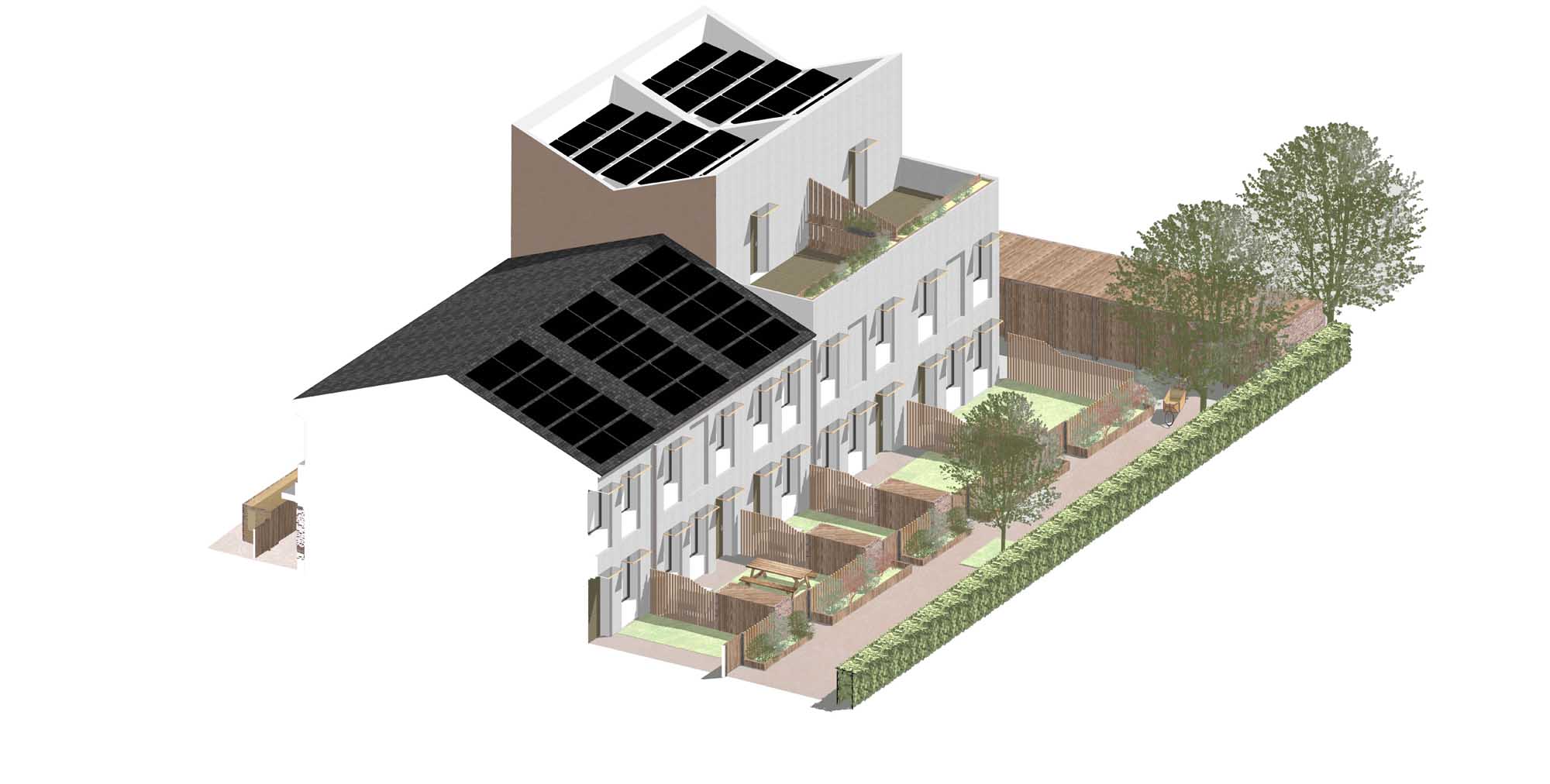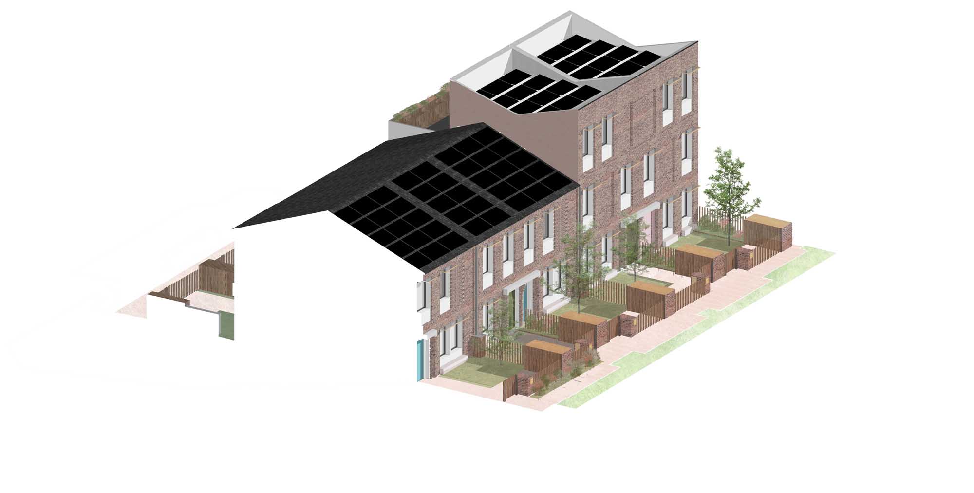 As York is in the north of England, where daylight hours are shorter than in the south and the sun is at a lower angle, Mikhail Riches had to work out how to stop overshadowing from blocking the sunlight in winter. This involved modelling the roofscapes so the sun penetrated the ground floor windows in the kitchens and dining rooms. “It was a lot harder to achieve than Norwich as the angle of the sun is different,” Mikhail says.