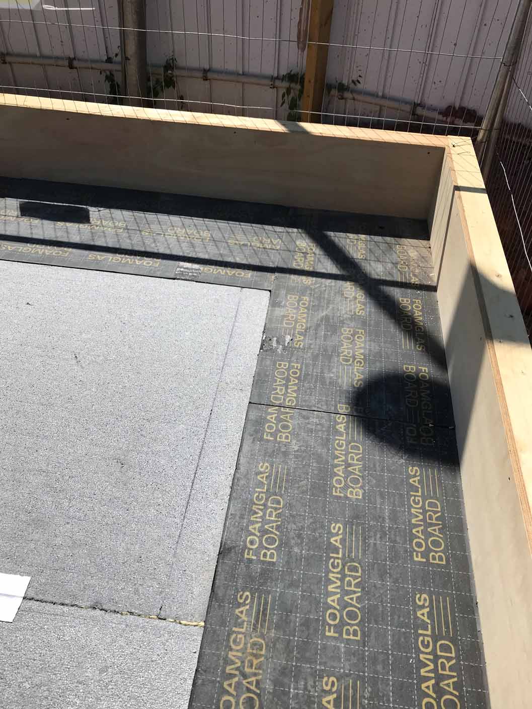 Ground floor: 65 mm bonded screed with underfloor heating with VCL, on 25 mm rigid insulation, on 300 mm reinforced concrete slab, on 100 mm of EPS insulation with Foamglas in load bearing areas. Concrete slab acting as airtight layer. U-value: 0.206 W/m2K