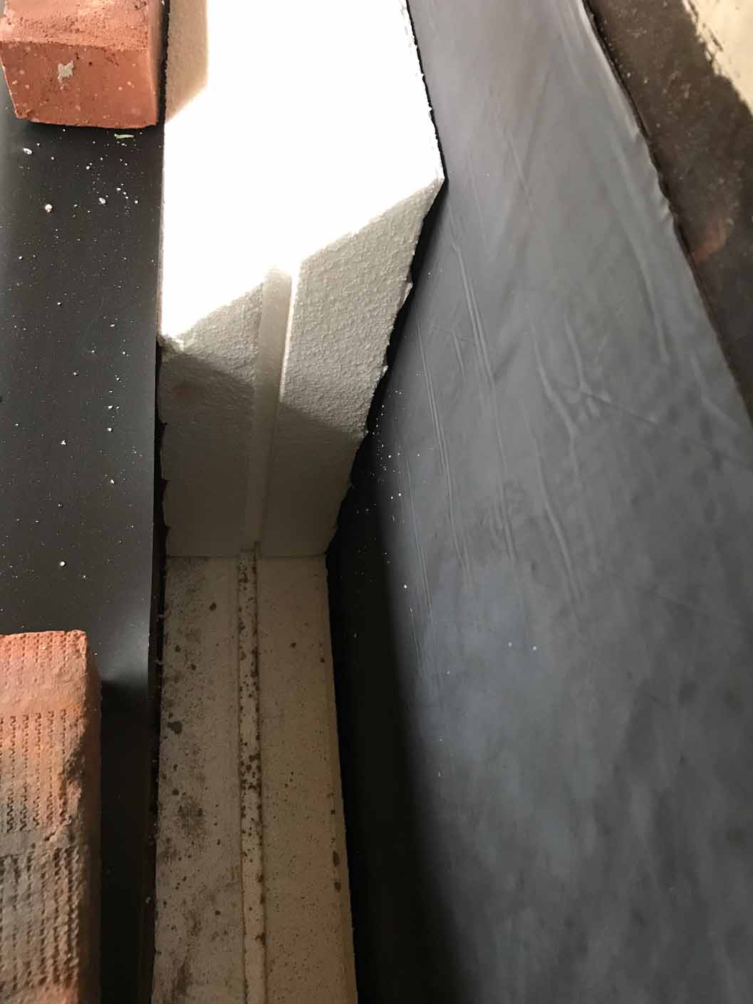 To offer the depth of reveals needed for controlling summer solar gains, the windows and doors are not set in the line of the insulation, but rest on the inner concrete frame, with the insulation line kept continuous by the addition of a Compacfoam “frame round the frame” overlapping the cavity insulation. “This was fiddlier to design, but actually, it was easier to build, as the weight of the doors and windows sits over the structure,” Kirk Rushby explained.