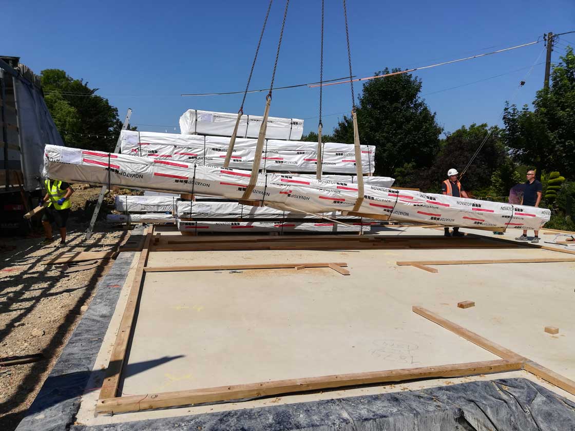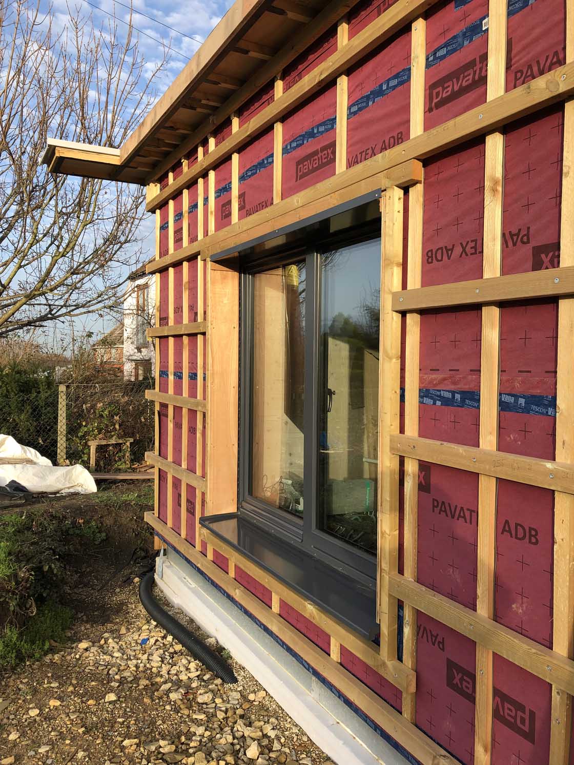 Thermal bridging: Default building regulations assumptions (Y-value 0.15 W/m2K) would mean 60 per cent of all heat loss goes through thermal bridges. Vigilant design and attention to building physics reduced this by 90 per cent (Y-value 0.015 W/m2K). Insulated raft foundation. Reducing the timber fraction by using engineered I-beams.