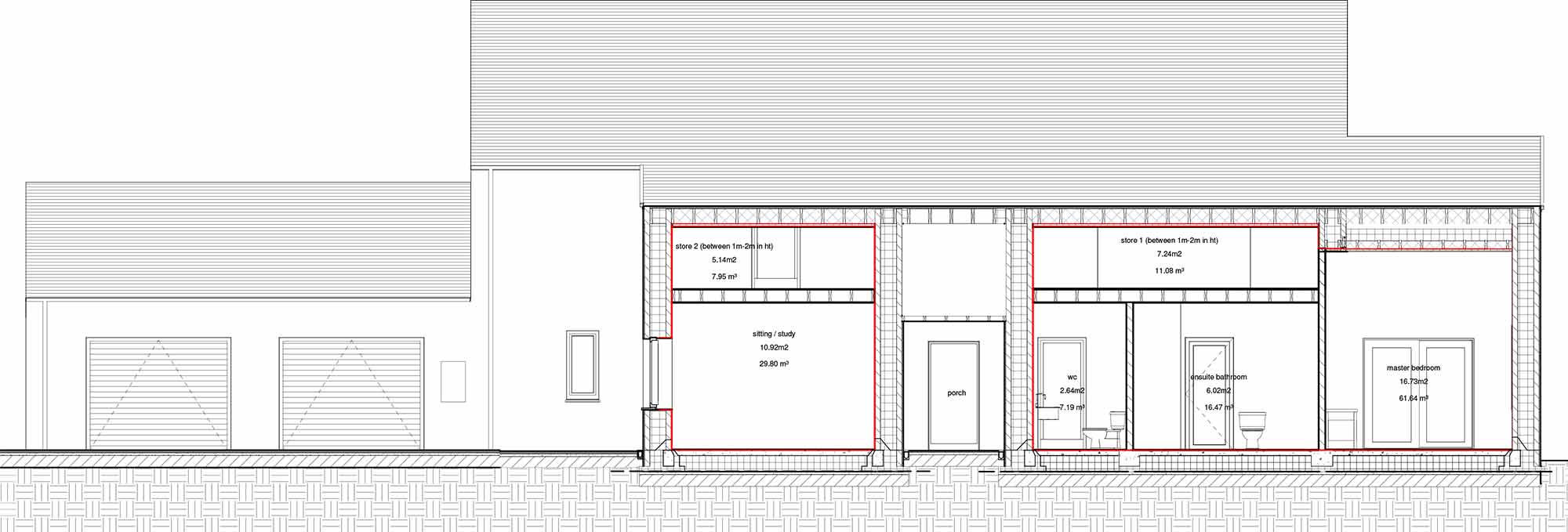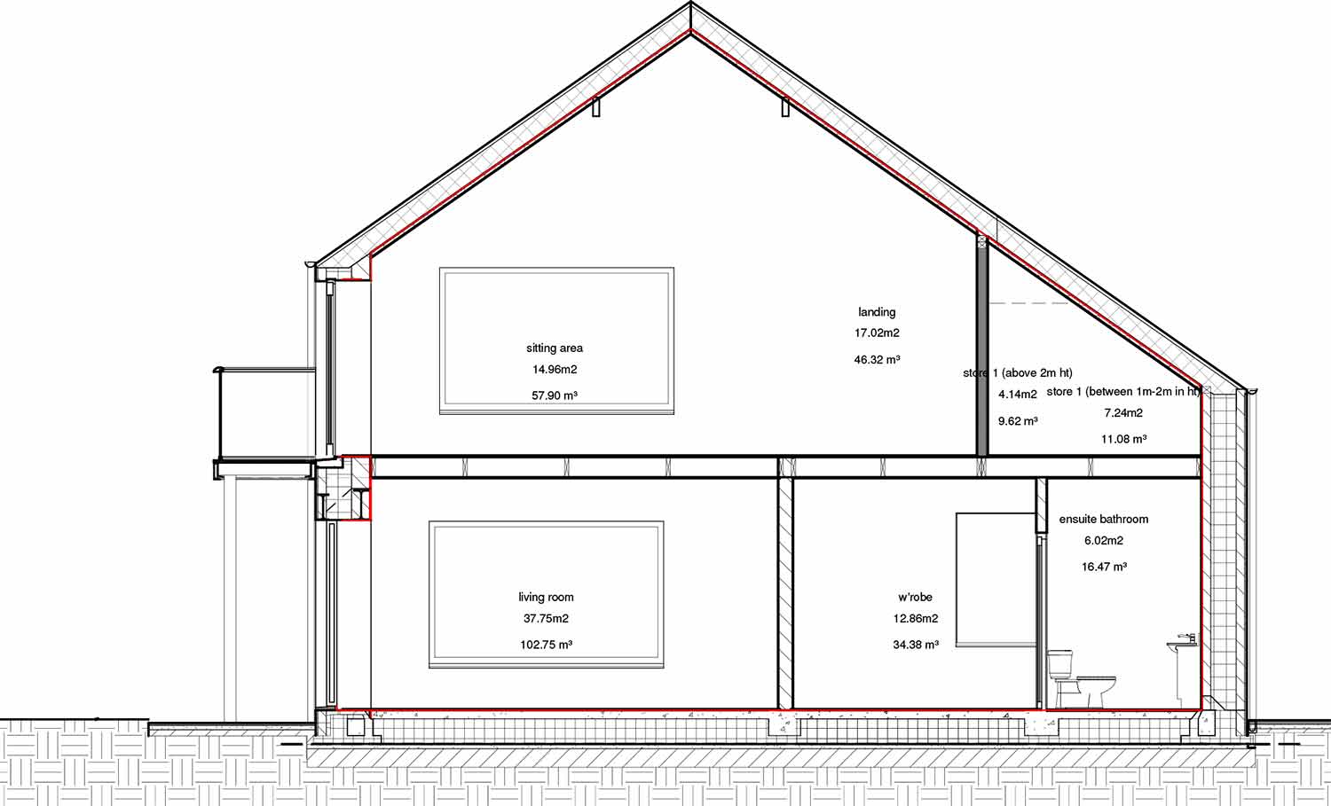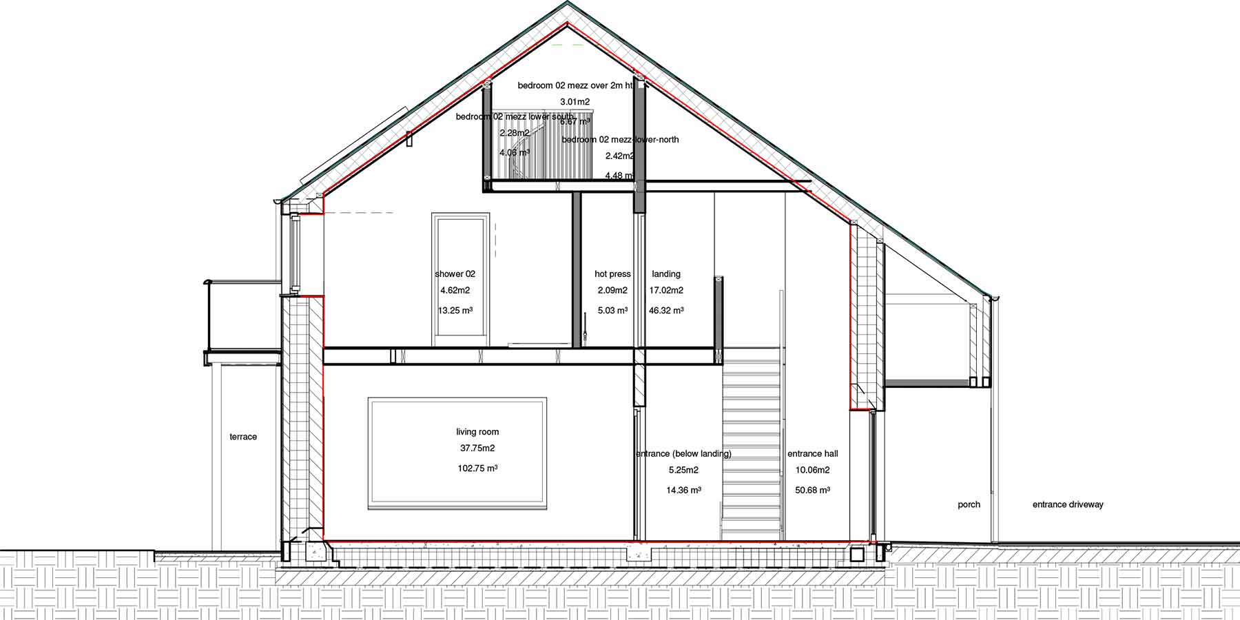 Roof: Natural slate finish externally on 50x35 battens / counter battens, followed underneath by breathable roofing underlay, 225mm timber rafters insulated with 220mm Isover Metac insulation (with max 0.035W/mK thermal conductivity) breathable airtightness / vapour control membrane, 50mm insulation backed plasterboard ceiling. U-value: 0.14 W/m2K