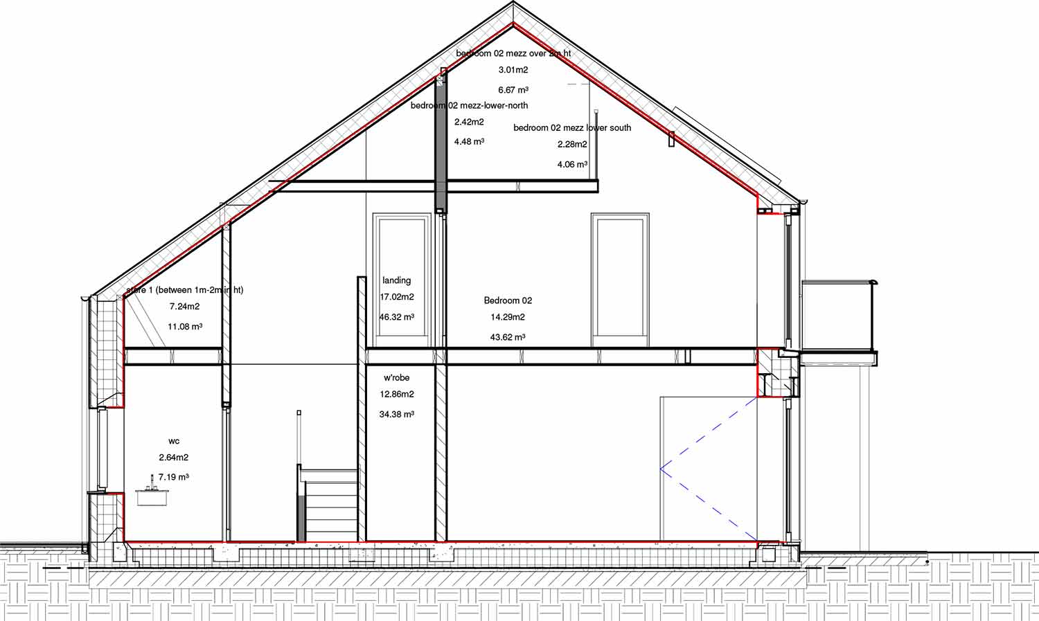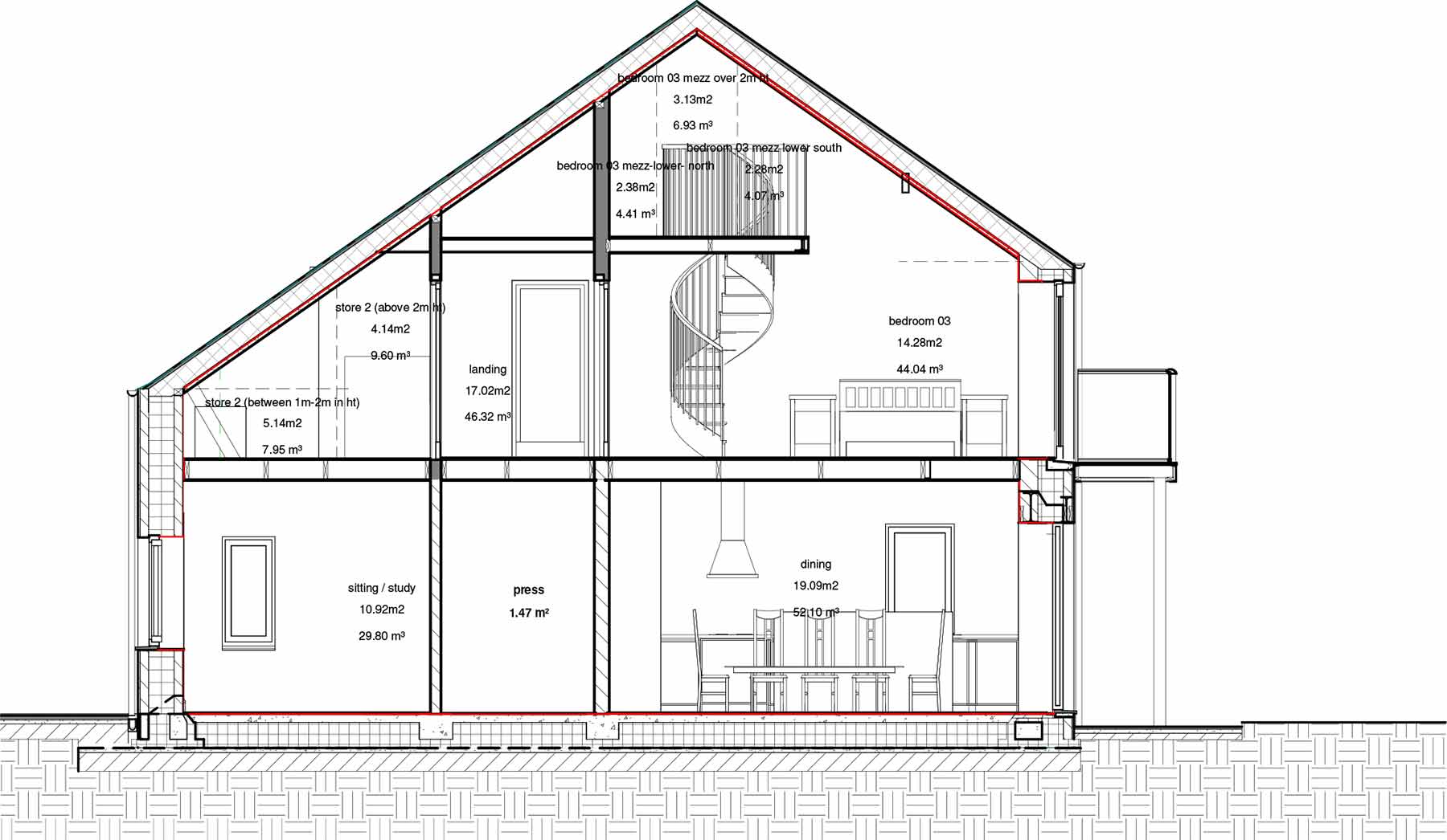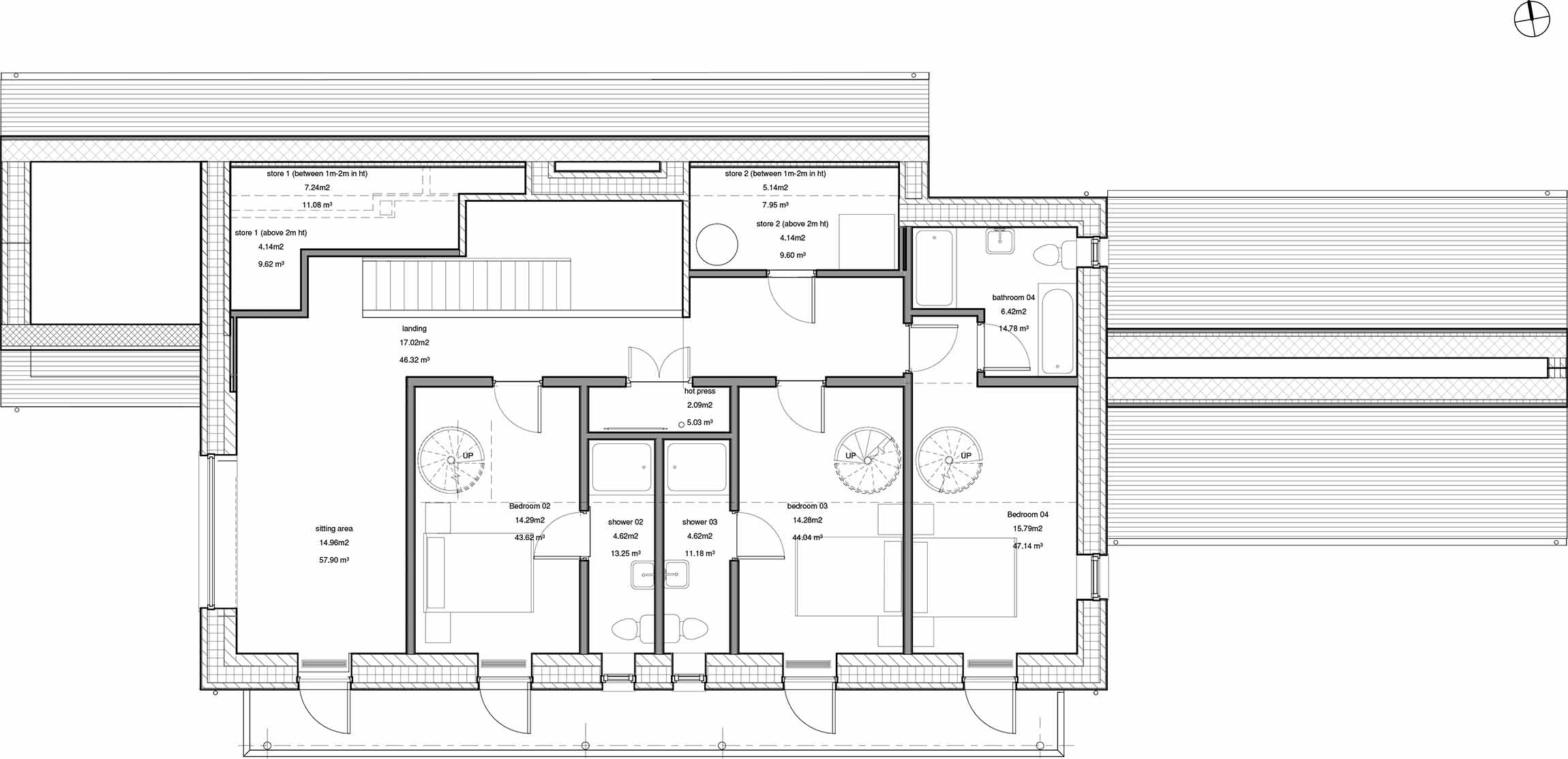 Roof: Natural slate finish externally on 50x35 battens / counter battens, followed underneath by breathable roofing underlay, 225mm timber rafters insulated with 220mm Isover Metac insulation (with max 0.035W/mK thermal conductivity) breathable airtightness / vapour control membrane, 50mm insulation backed plasterboard ceiling. U-value: 0.14 W/m2K