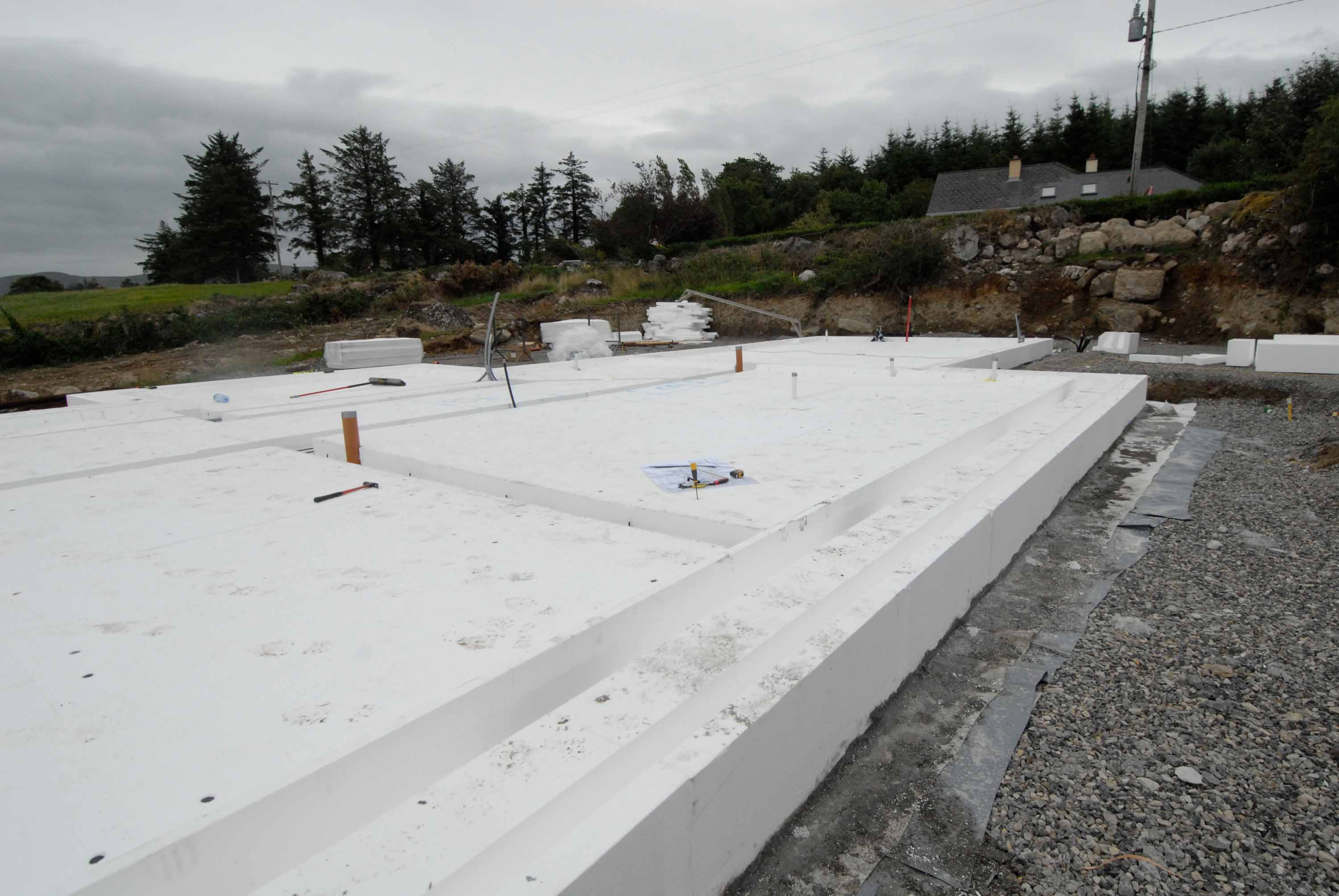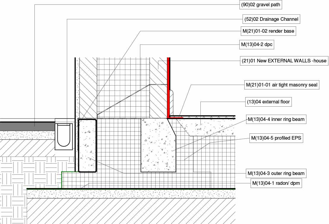 Ground floor: Kingspan insulated passive foundation / floor system incorporating 300mm structural EPS insulation under slab with min 100mm structural EPS wrapped around foundation ring beams. U-value: 0.11 W/m2K