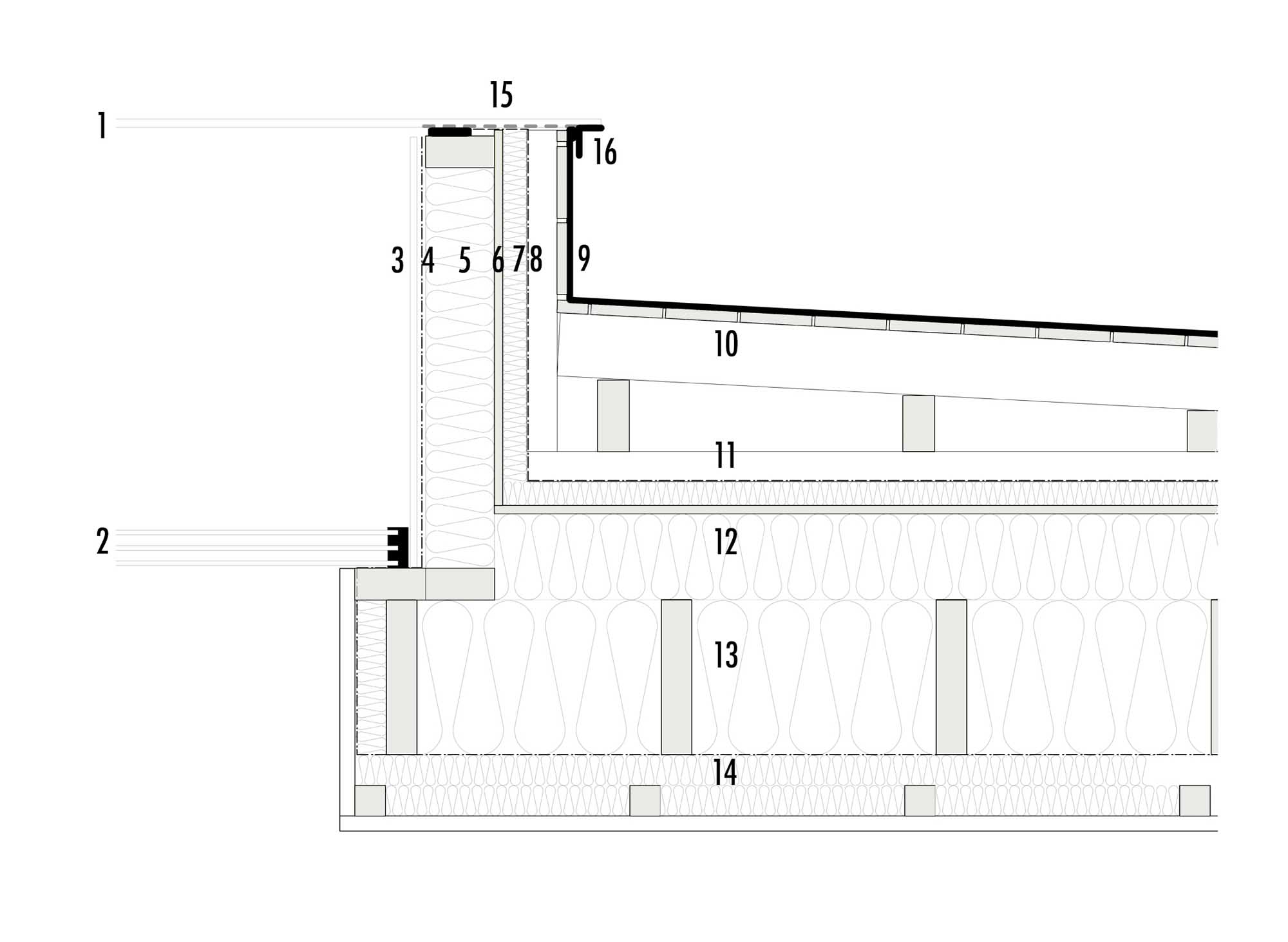 1 Toughened glass rain screen; 2 Triple glazed unit; 3 Coloured (white) glass liner; 4 Intello vapour control layer; 5 Mineral wool insulation between timber studs; 6 Elke Strongboard; 7 35 mm Gutex Multiplex Top with Heco fixings; 8 Solitex breather membrane; 9 44 mm treated timber batten with ventilation & softwood boarding with vent gaps, zinc roofing; 10 Rafters to fall; 11 Solitex breather membrane; 12 Mineral wool insulation between 125 mm cross timbers; 13 Mineral wool insulation between 250 mm cross timbers; 14 Intello vapour control layer above mineral wool insulation between 2 layers 44 mm timber batten with plasterboard; 15 Fritting