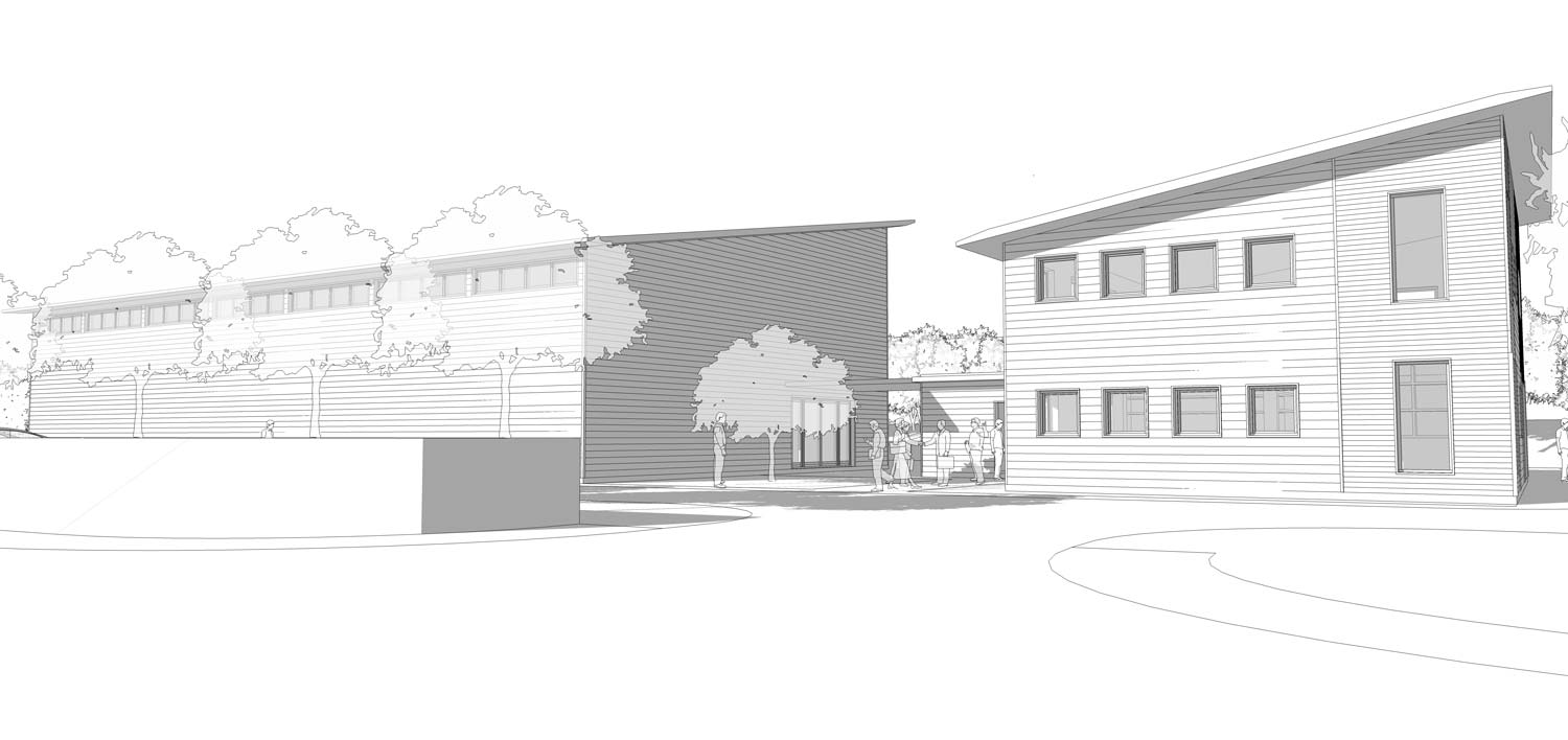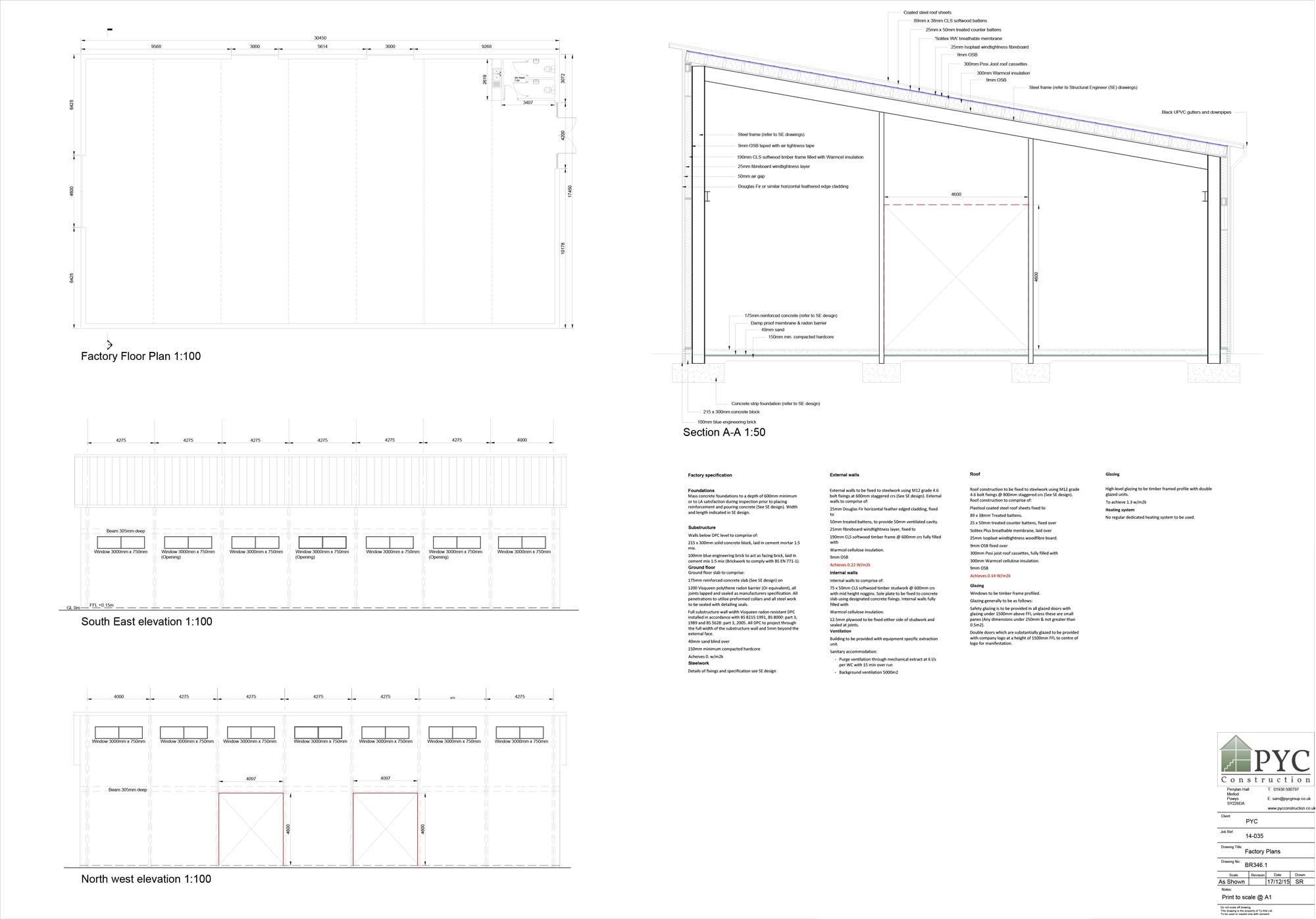 In 2014, the company found a greenfield site on an industrial estate in Welshpool, just a few miles from their old offices. As well as the fast transport links, staff could continue to live locally. Meade made preliminary sketches for the entire site on a train journey to London one day. The most important elements, he felt, were a factory containing a small office and observation room, a larger separate office building, car park, outside storage, meeting room, kitchen and toilets.