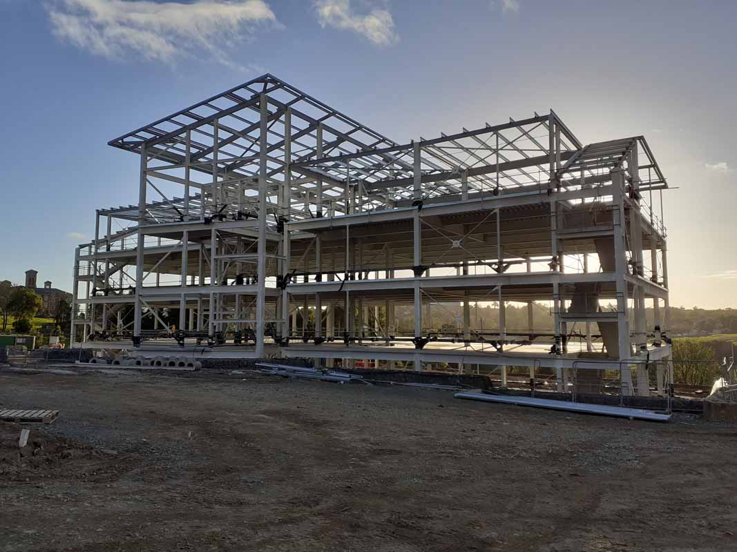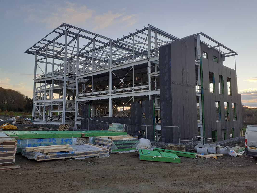 The detailed design stage coincided with the pandemic and everything that went with it. A subcontractor was commissioned to provide the timber wall panels that the design team had settled on. Covid-related issues forced that contractor out of the project in mid 2020 however, and finding a replacement proved challenging. During this period, the design team almost decided on a cross laminated timber (CLT) construction. This is the process of using bonded layers of solid wood panels for floor, roof and wall elements, thereby achieving carbon savings that are vastly superior to concrete and steel.