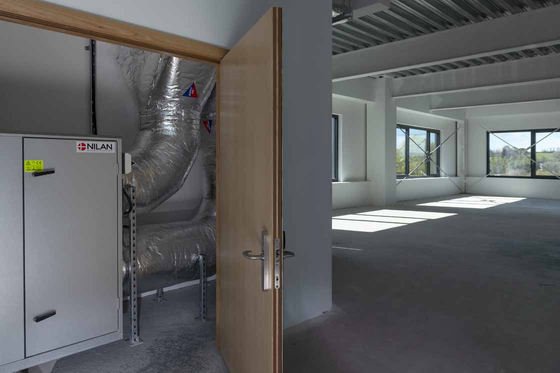 Heating, cooling and ventilation system: Air-based heat and cooling distribution via the 2 x Nilan VPM 360 heat recovery ventilation units per floor. Each unit has a 3,600 m3/h capacity, combining passive and active heat recovery as well as heating and cooling to all office spaces. The building is completed to a shell and core standard with fit-out by future tenants. Individual split units to meet localized heating and cooling needs if necessary for each office area are, therefore, to be selected as tenants assume occupancy.