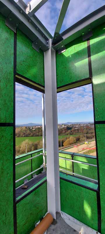 Stephen Donoghue lists the advantages of this build approach. “There’s less mess, it’s cleaner and safer, and the panels go up faster, plus you get better quality. And you don’t need scaffolding. There was no scaffolding erected on this building.”