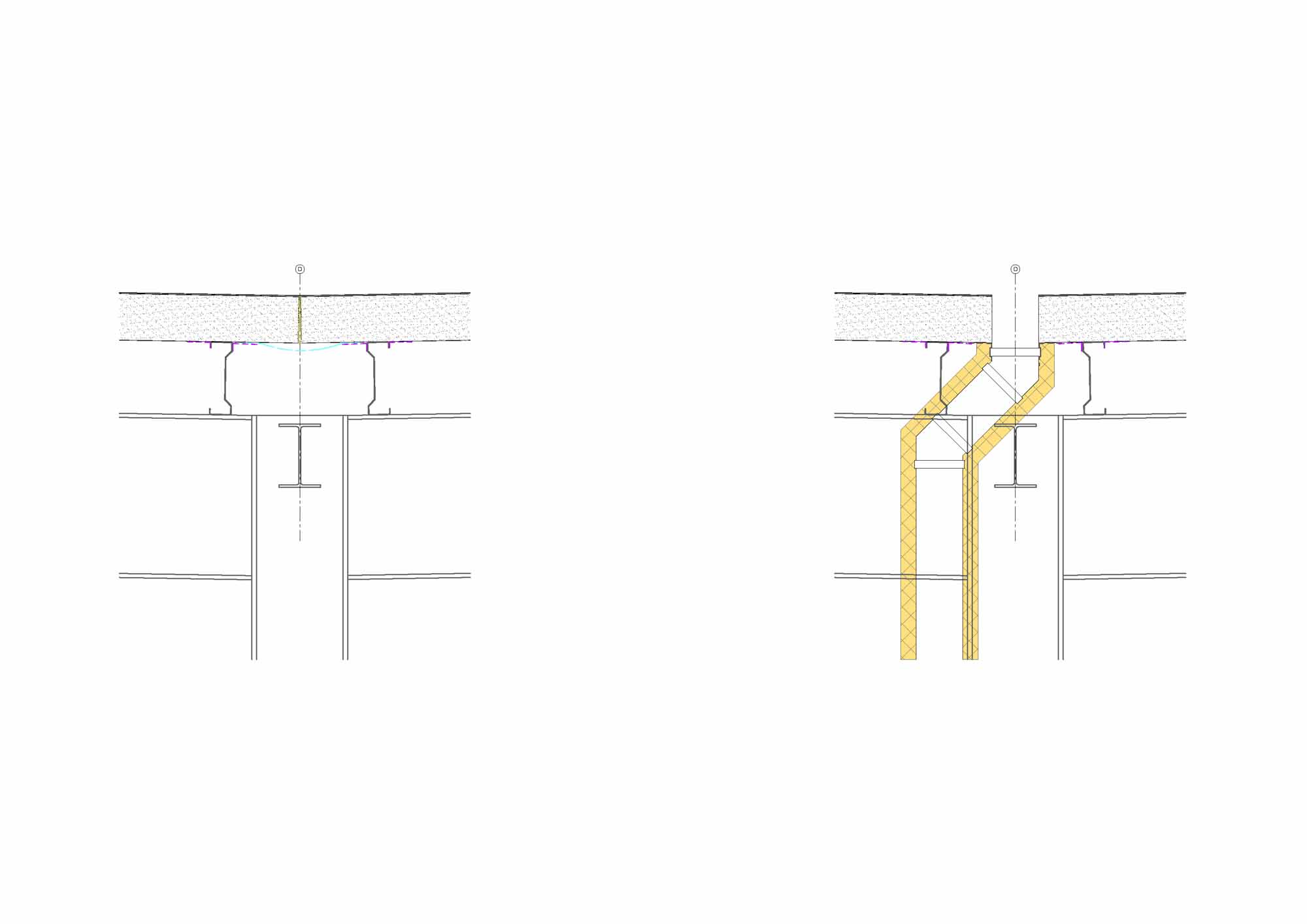 To obviate thermal bridging where the external walls meet the primary steel structure, the wall panels were hung by steel lugs from the steel beams