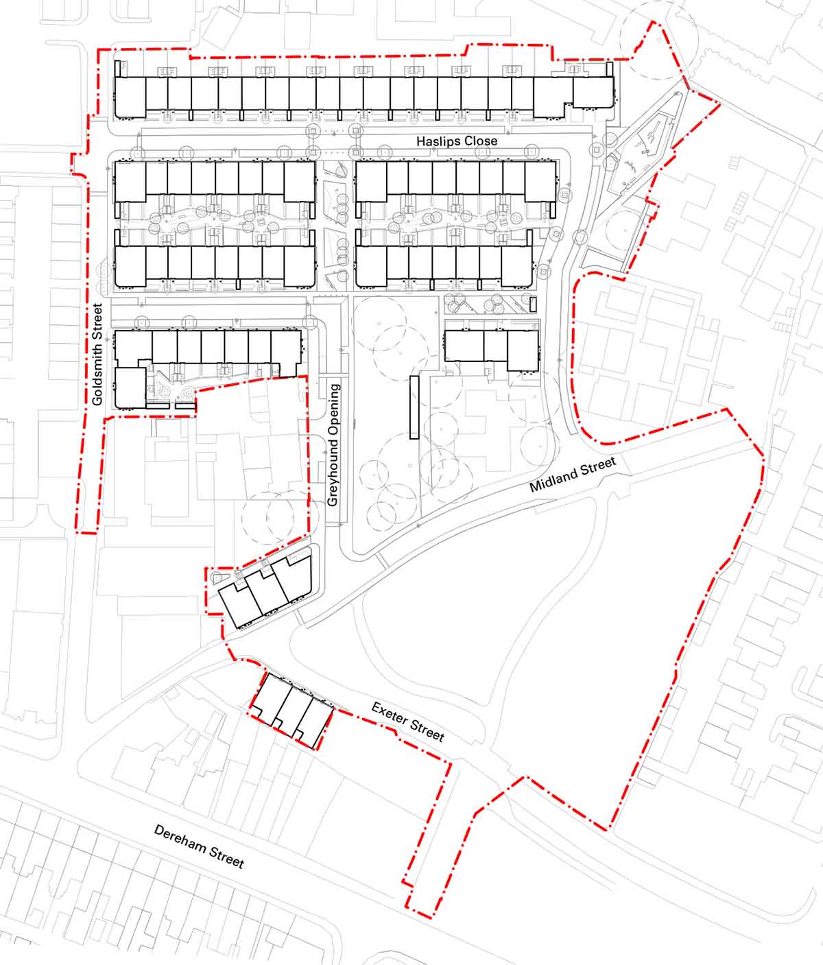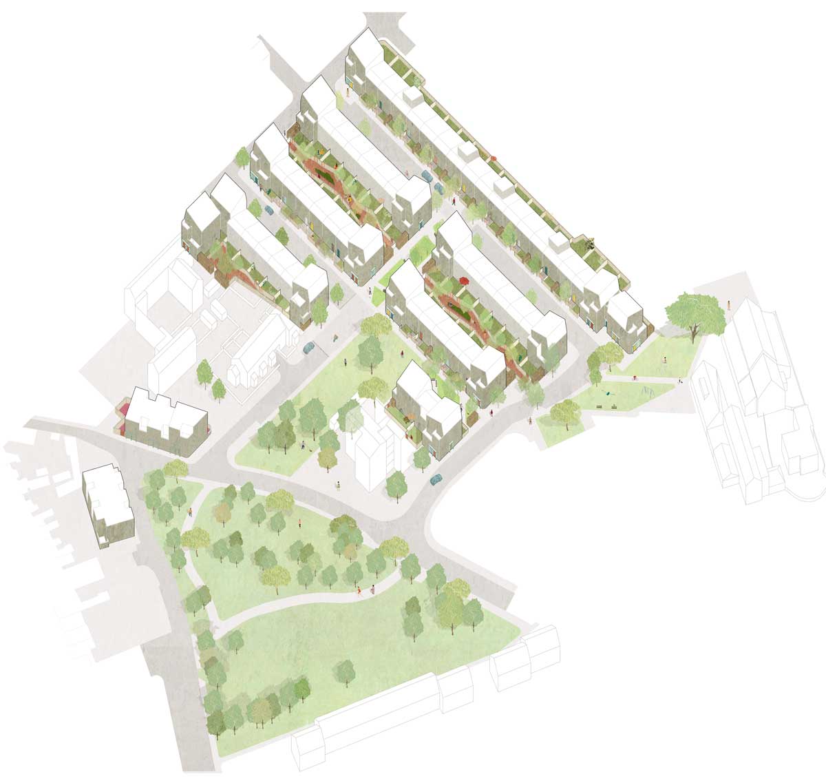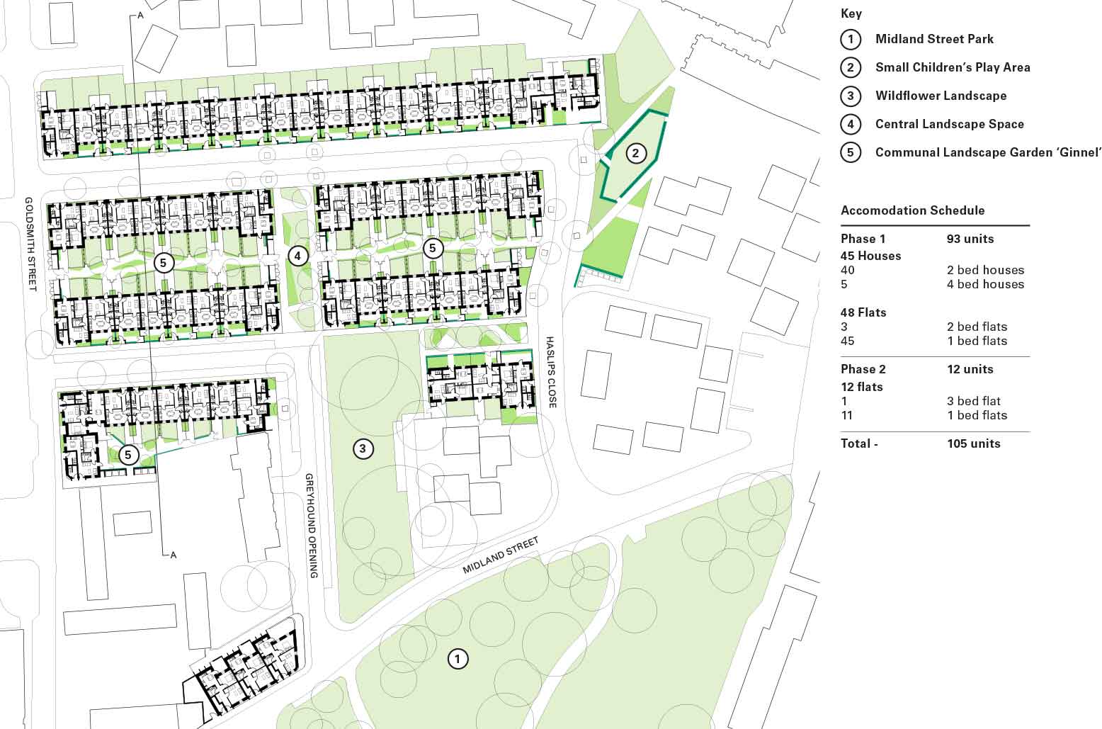 The blocks are spaced 14 m apart between fronts, and 14 m between backs (rather than the more conventional 22 m spacing) to increase the density (which is 82 dwellings per hectare) and promote an urban feel, and a sense of community. The terraces are terminated at each end by three-storey blocks of three flats each.