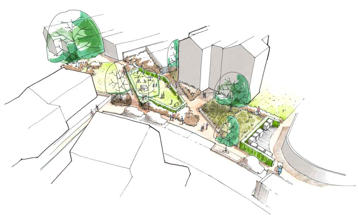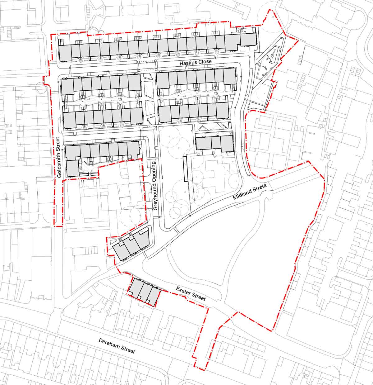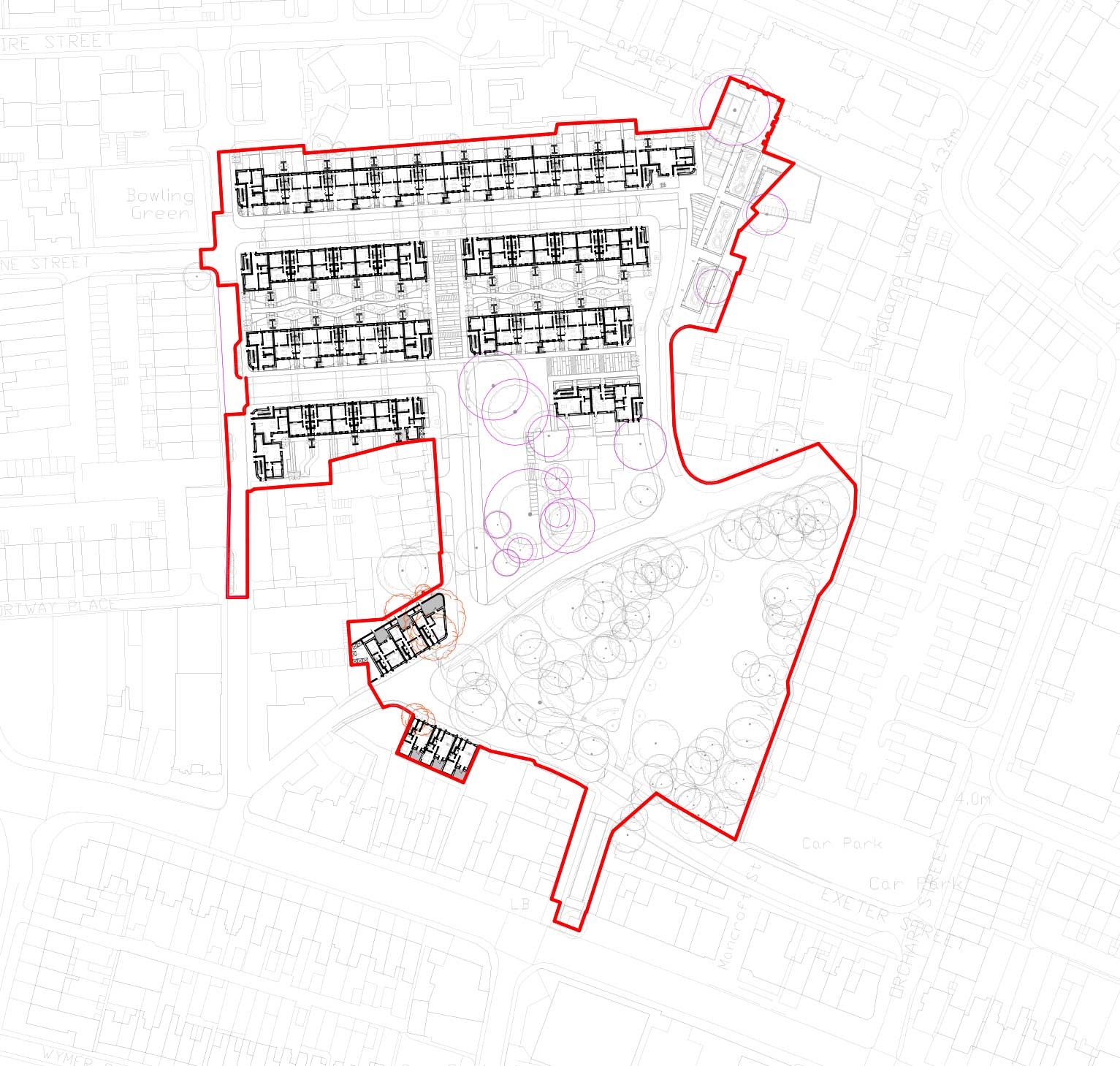 The blocks are spaced 14 m apart between fronts, and 14 m between backs (rather than the more conventional 22 m spacing) to increase the density (which is 82 dwellings per hectare) and promote an urban feel, and a sense of community. The terraces are terminated at each end by three-storey blocks of three flats each.