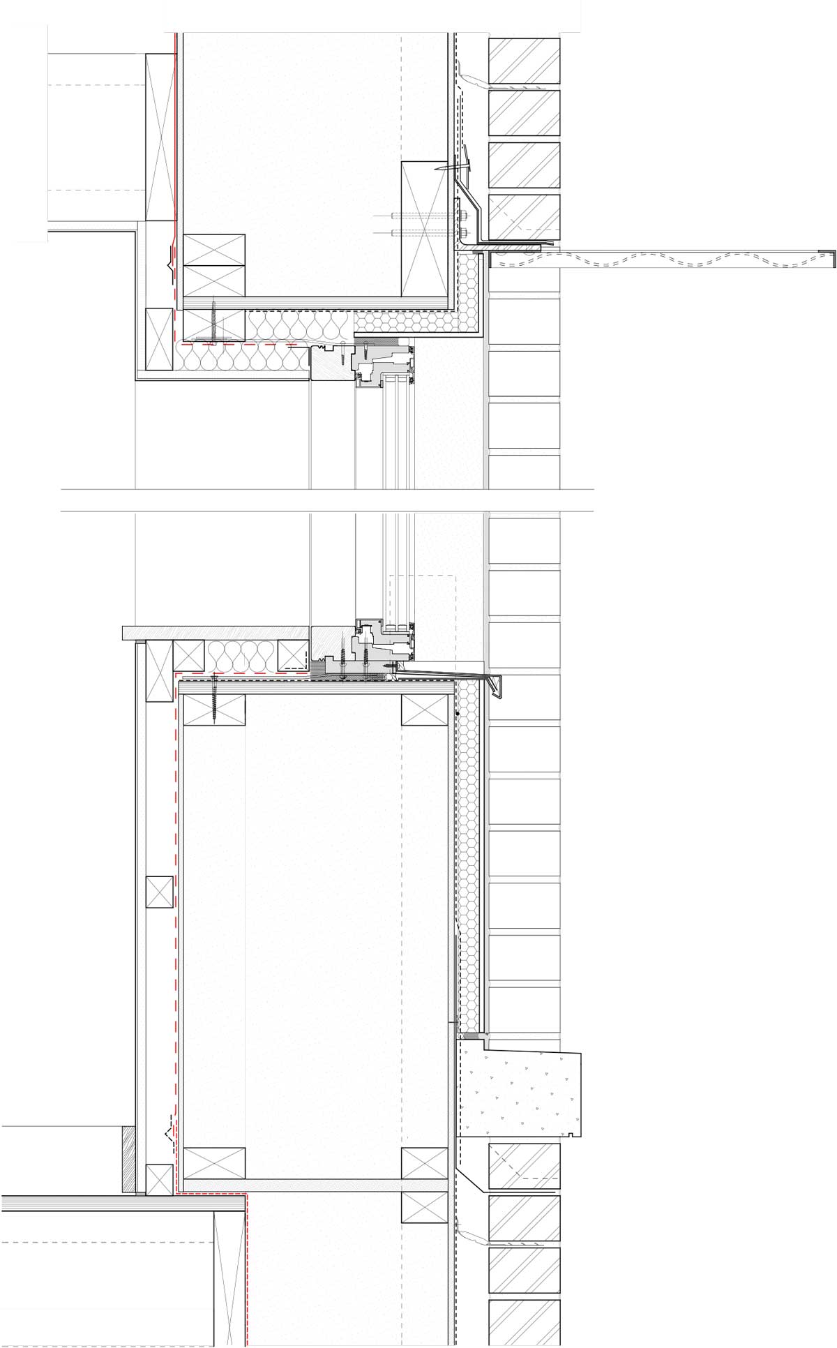 To achieve passive house insulation standards, the brick-clad walls are approximately 600 mm thick, including the cladding, and the rendered walls are approximately 500 mm thick, so windows have deep, insulated reveals, sills and soffits. Window openings, which are larger than the windows themselves, expose the rendered insulation layer externally as window surrounds, and have pre-cast concrete sills.