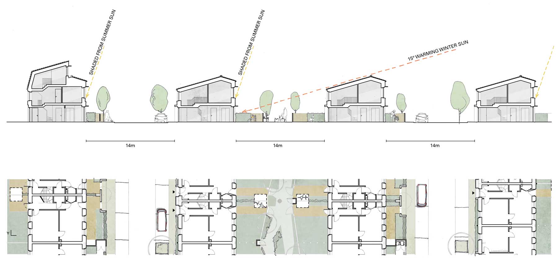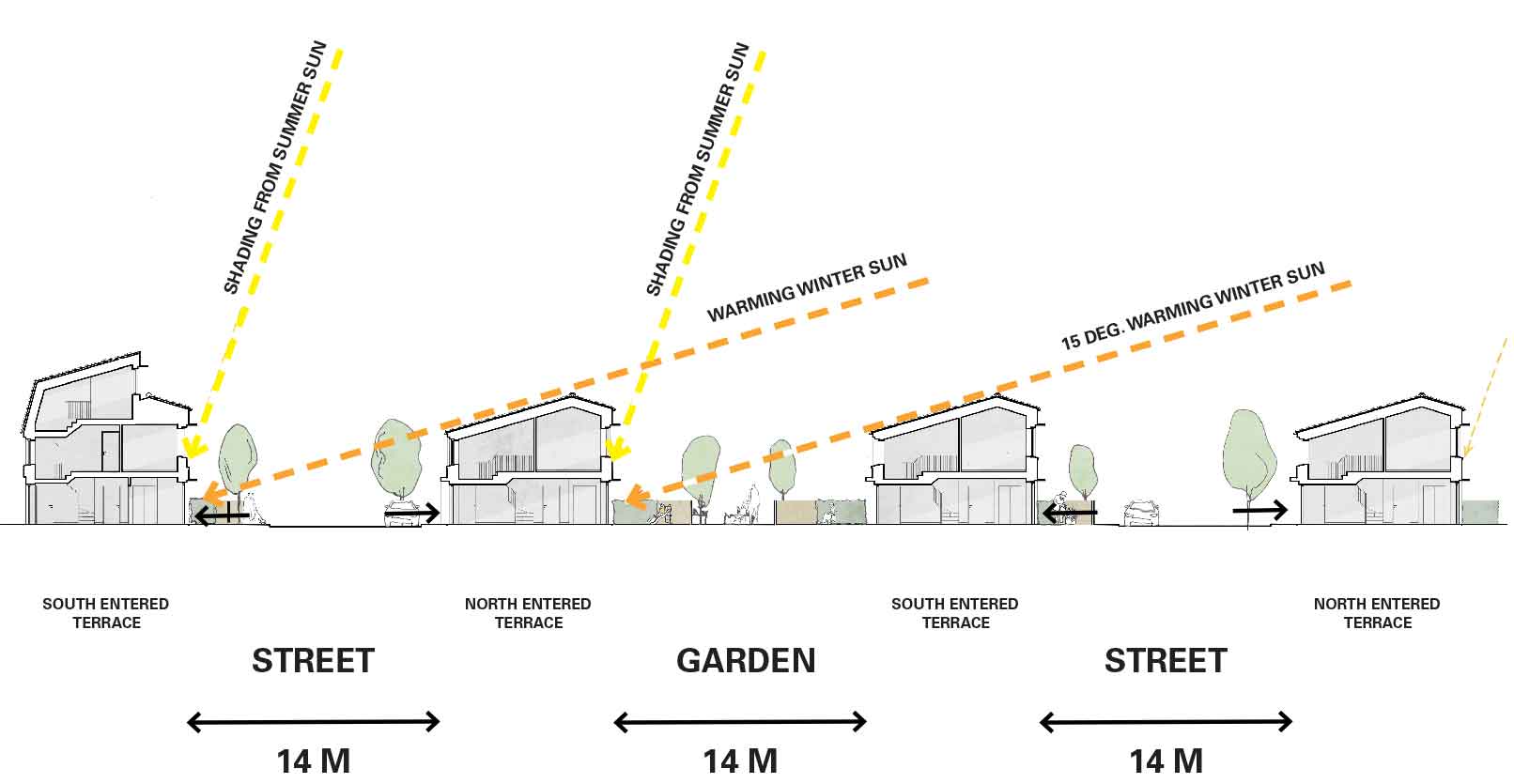 (above) Graphic showing how the shading design of the terraces is confi gured to allow in low angle winter sun, but to block out the high angle summer sun that is associated with overheating; 14 metre spacing between rows (as opposed to the conventional 22 metres) helps to create an urban feel.