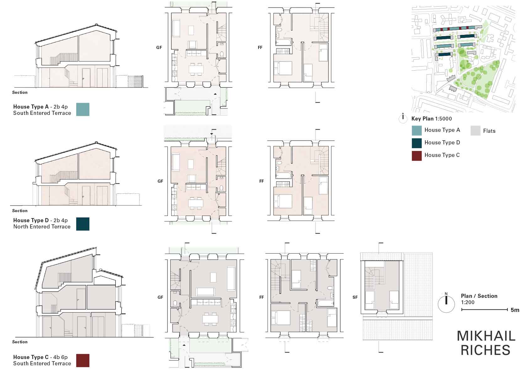Building type: Social housing scheme of 45 houses & 60 flats, all timber frame. Floor area from 51 m2 to 121 m2.