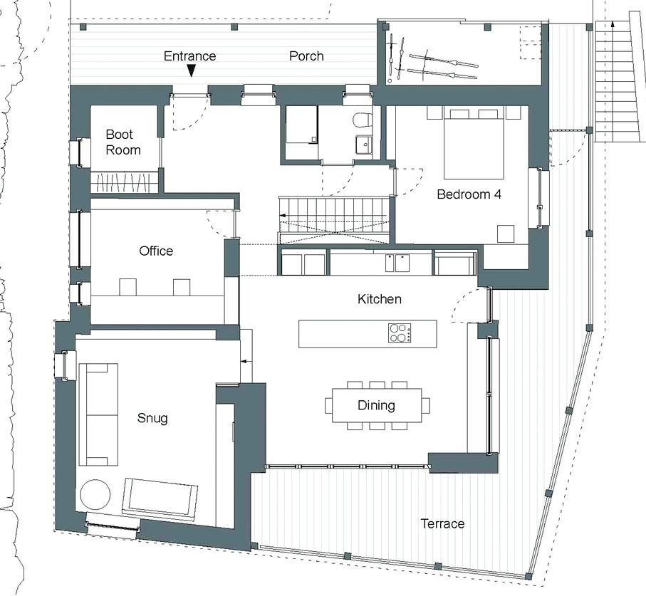 The house was built into the hillside with a retaining wall to keep to the height of the original bungalow, so the dwelling is single storey on one side and two storeys on the other