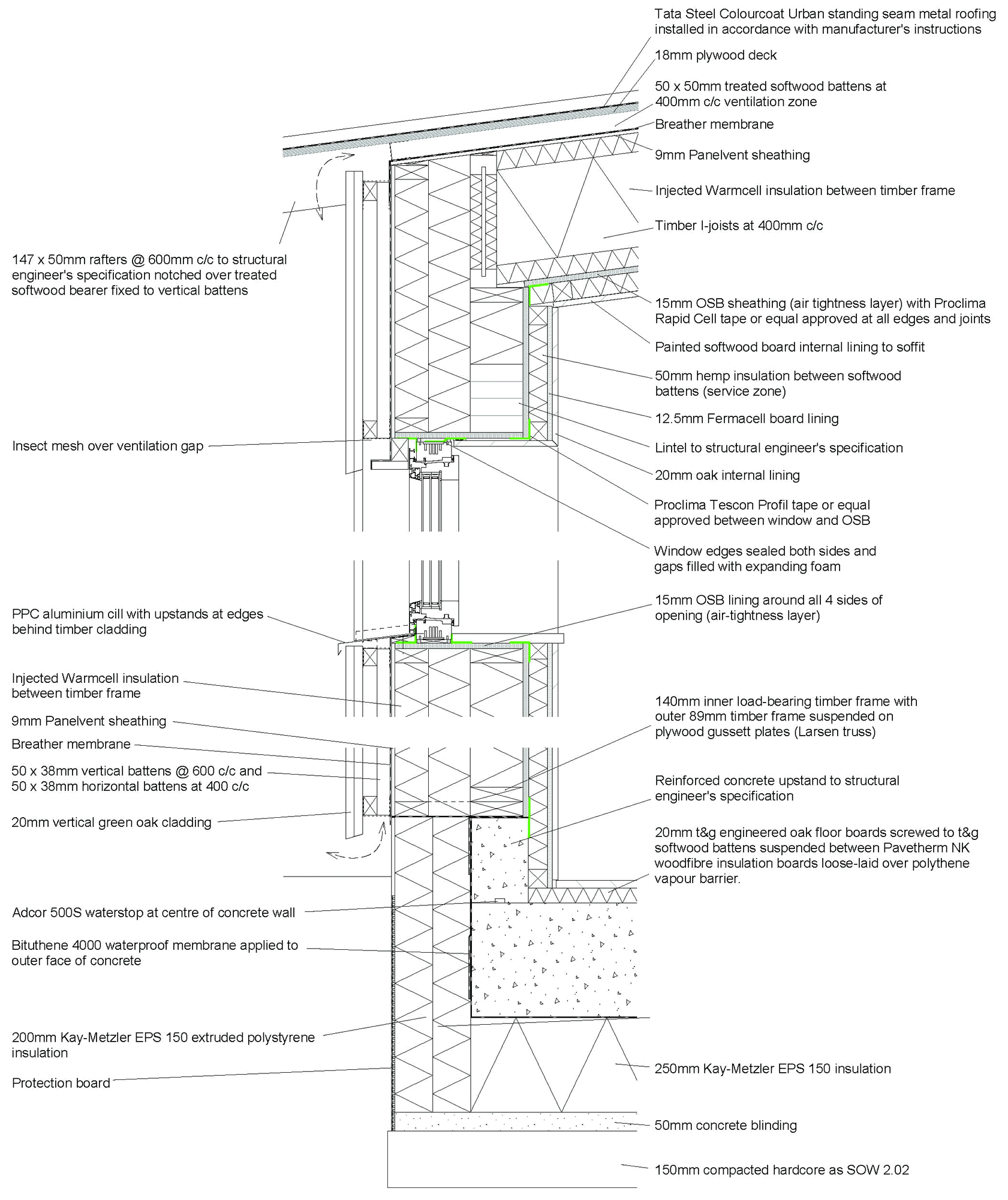 Walls: 20mm green oak cladding, on treated softwood battens and counter battens, on breather membrane & 9mm Panelvent sheathing board, on 340mm Warmcel insulation between studs (twin softwood timber frames, outer frame hung off inner frame to avoid thermal bridges), on 15mm OSB sheathing with taped joints (airtightness layer), on 50mm softwood battens forming service zone with hemp insulation between battens, on 12.5mm Fermacell internal lining. U-value: 0.12 W/m2K
