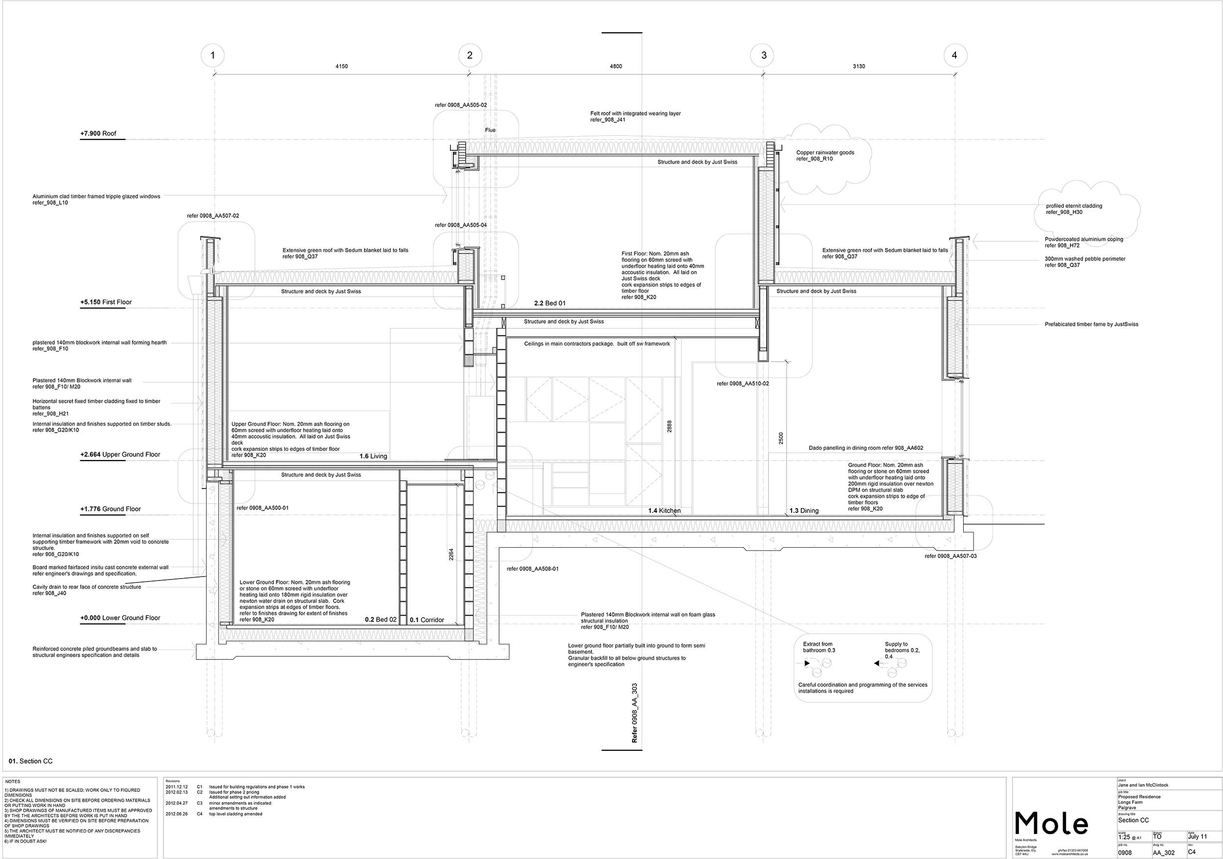 Overheating (PHPP, percent of year above 25C): 9% Ground floor: 20mm ash flooring or stone on 60mm screed with underfloor heating laid onto 200mm rigid insulation over Newton DPM, on structural slab, with cork expansion strips to edge of timber floors. U-value: 0.10 Wm2K