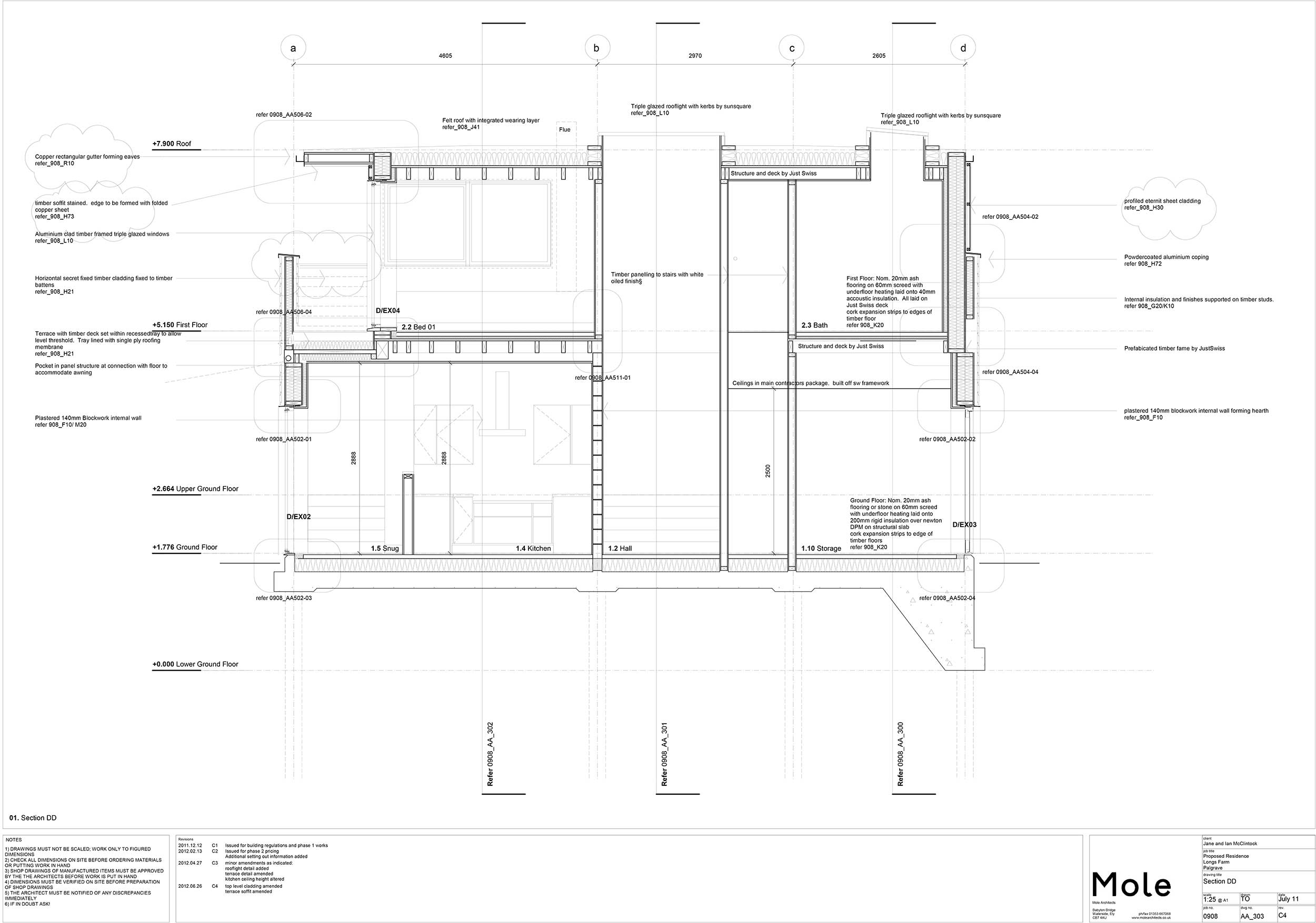 Roof: Felt roof membrane with integrated wearing layer. 200mm Ecotherm insulation laid to 1:80 falls. Vapour barrier laid over JS deck and lapped up parapet to form overlap with waterproofing membrane. Beams and deck left exposed. U-value: 0.11 W/m²K