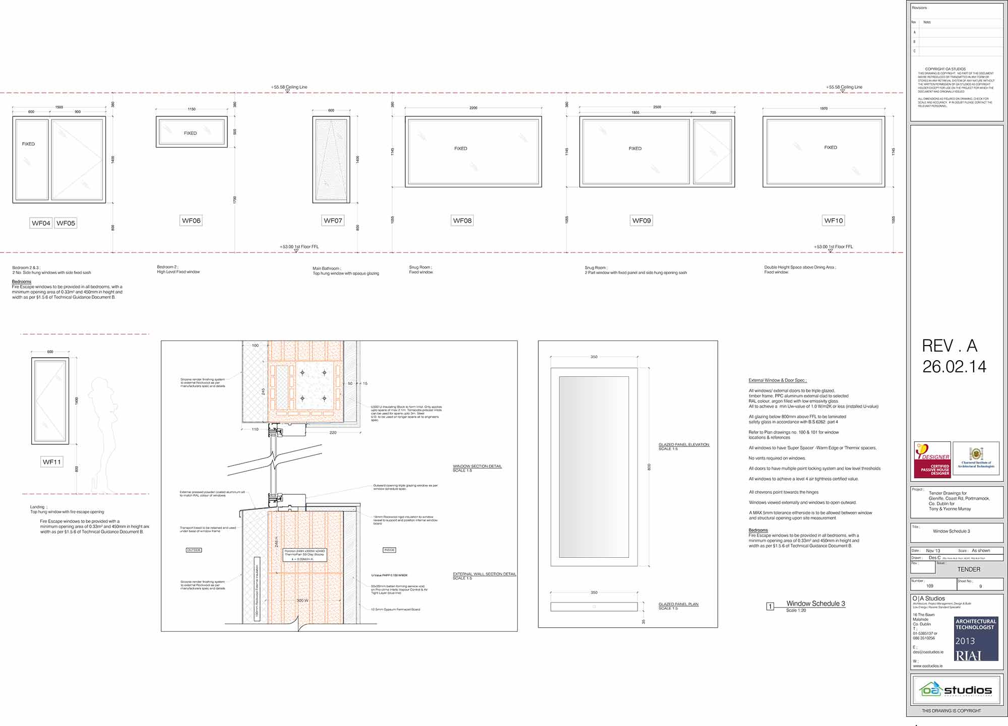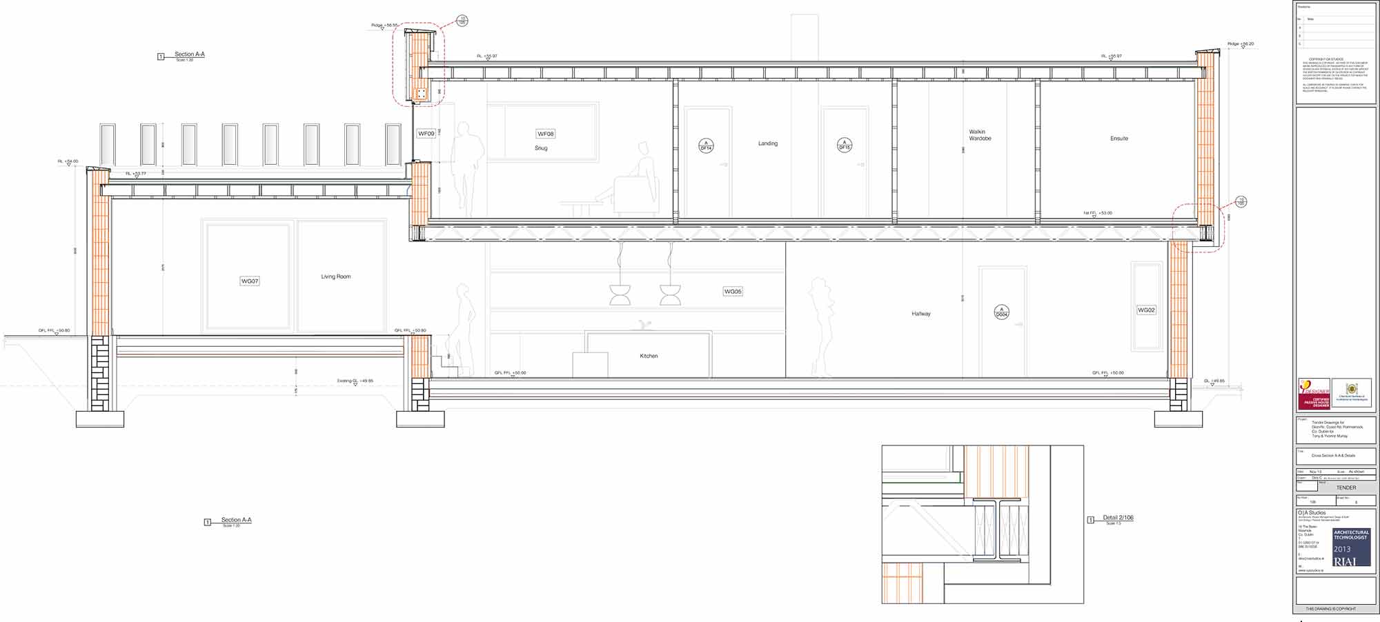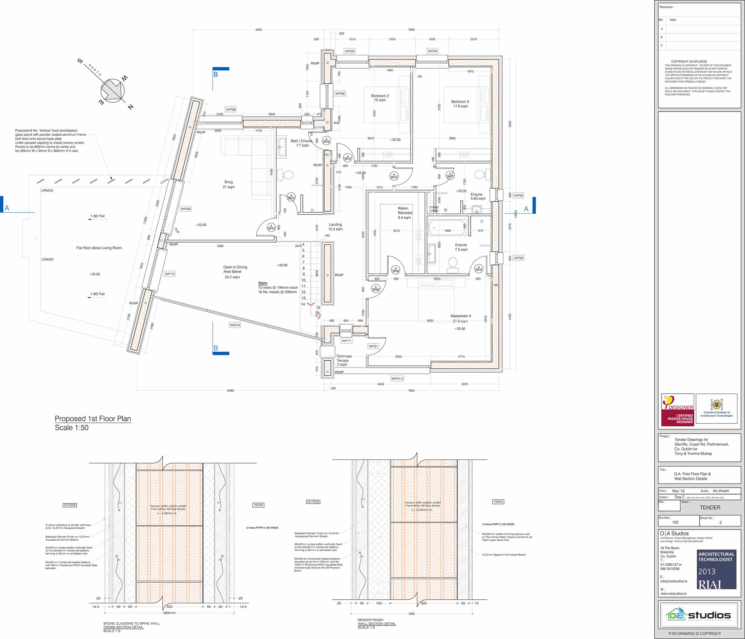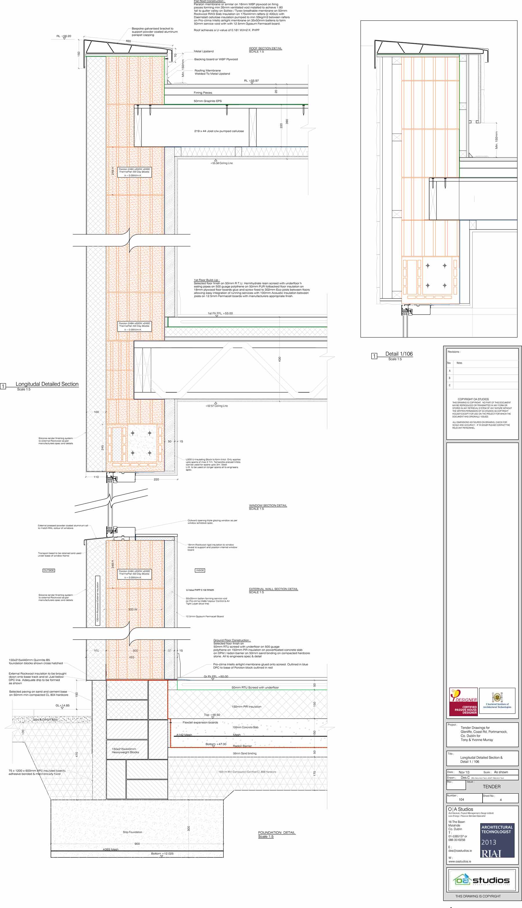 Roof: Paralon membrane externally to manufacturers spec on 22mm WBP plywood, on firring pieces installed to achieve 1:80 fall to gutter valley on Solitex / Tyvex breathable membrane, on 100mm Xtratherm Thin-R slab insulation, on 225x44mm rafters at 400c/c with 300mm thick Earthwool insulation between rafters, on pro clima Intello airtight membrane, on 35x50mm battens to form 50mm service void with 12.5mm Gyproc Fireline 30 minute board. U-value: 0.18 W/m2K