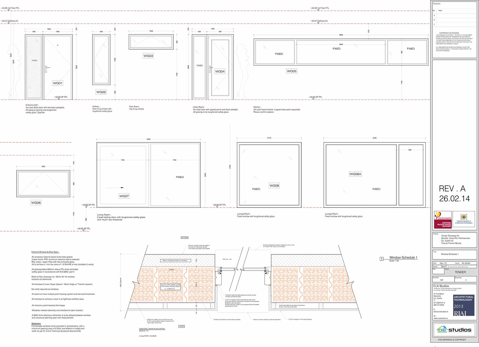 Thermal bridging: Course of Quinn Lite B7 insulated blocks below DPC Level, warm roof construction, 100mm graphite EPS external insulation, below DPC level external 50mm XPS insulation, 25mm XPS insulated window reveals.