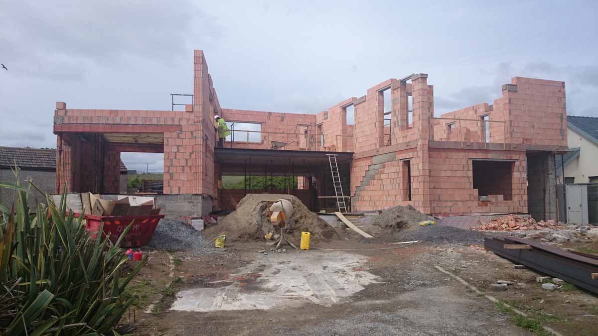 The poroton walls are visible here rising up from the strip foundation, which was insulated with 150mm Xtratherm PIR board