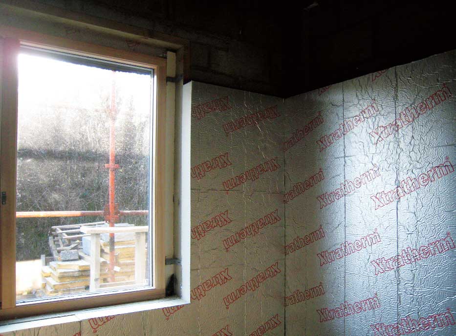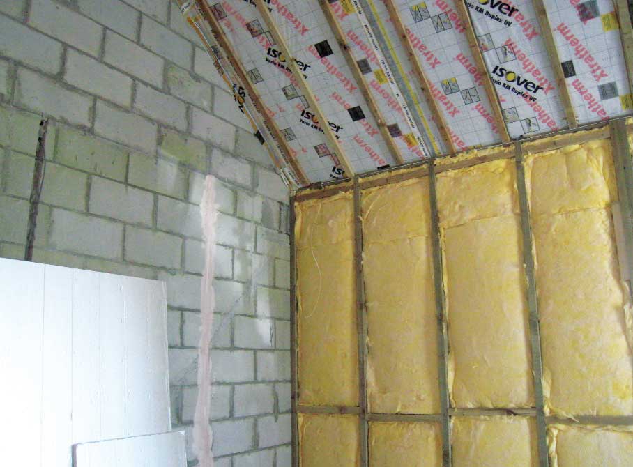 When Peter’s team began work on the existing walls, they found that they were not up to standard, so the decision was taken to demolish, leaving them with just the existing slab. Naughton liaised with MosArt in drawing up details to deal with thermal bridges. It was decided that the slab would now be treated as a base layer, on which 350mm of Xtratherm PIR was installed. This insulation was then extended up the inside of the external walls at a thickness of 100mm and below the rafter line at 75mm to create a continuous insulating layer. The 100mm cavity itself was pumped with bead.
