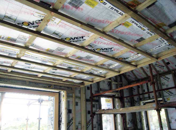 In order to minimise thermal bridges, internal walls were cut back at the point where they met the external walls, to allow a continuous layer of both insulation and air tightness membrane. In the same vein, ridge beams were finished to the inner leaf to prevent breaking the insulated seal.