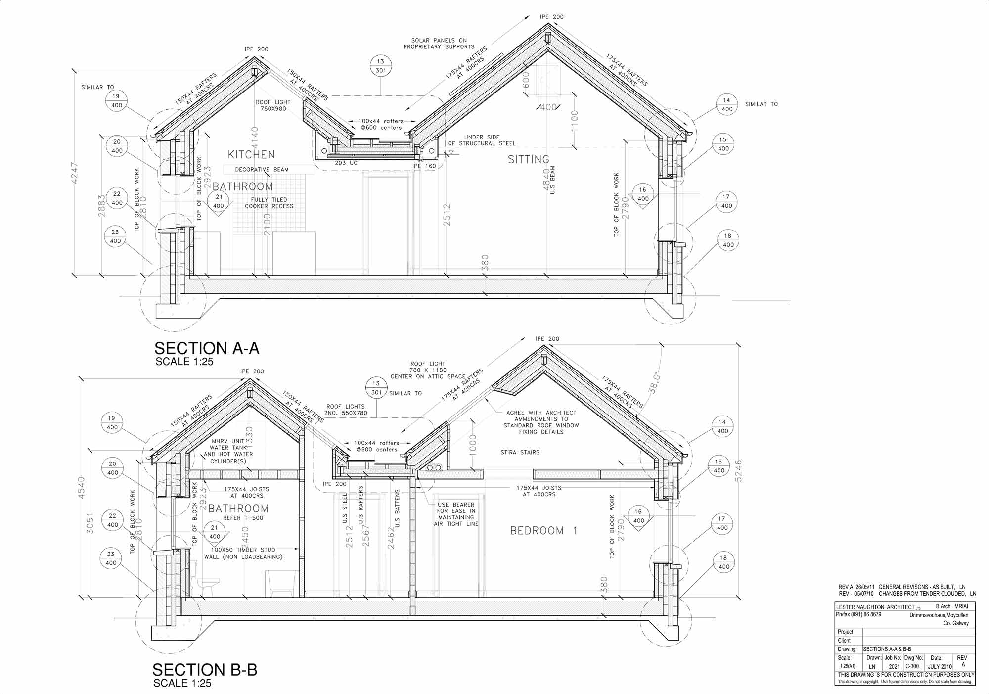 Thermal bridging: due to planning constraints the building retained an existing foundation slab so thermal bridges were avoided with an internal line of insulation around the structure. 350mm of PIR insulation was placed over the existing slab returning up the inside of the external walls 100mm thick and below the rafter line 75mm thick, all forming a continuous line. Where internal walls extended to the existing foundation slab they were in Quinn-lite B3 blockwork. On external walls the internal line of