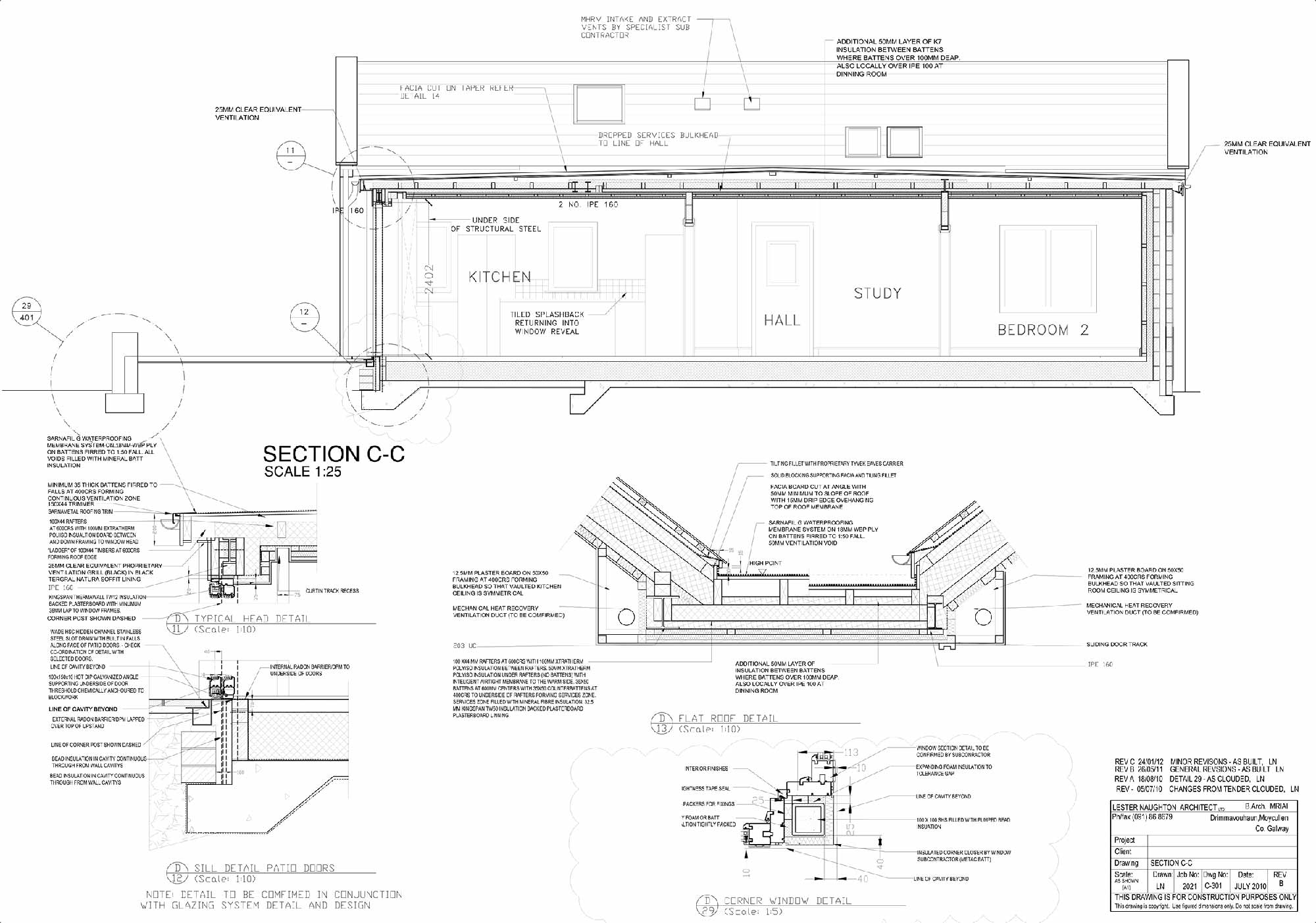 Flat roof: Sarnafil G waterproofing membrane system on 18mm wbp ply on battens firred to 1:50 fall. 100x44mm rafters at 600crs with 100mm Xtratherm Thin-R PIR insulation board between rafters 50mm ventilation zone maintained over rafters with additional 50mm Xtratherm Thin-R PIR insulation where battens are over 100mm deep. 50mm Xtratherm Thin-R under rafters with Isover Vario membrane to the warm side. 35x50mm counterbattens at 400mm centres with 35x50mm counterbattens at 600mm forming services zone. Services zone and all irregular voids filled with Isover Metac mineral batt insulation. 32.5 mm insulation-backed plasterboard internal lining.