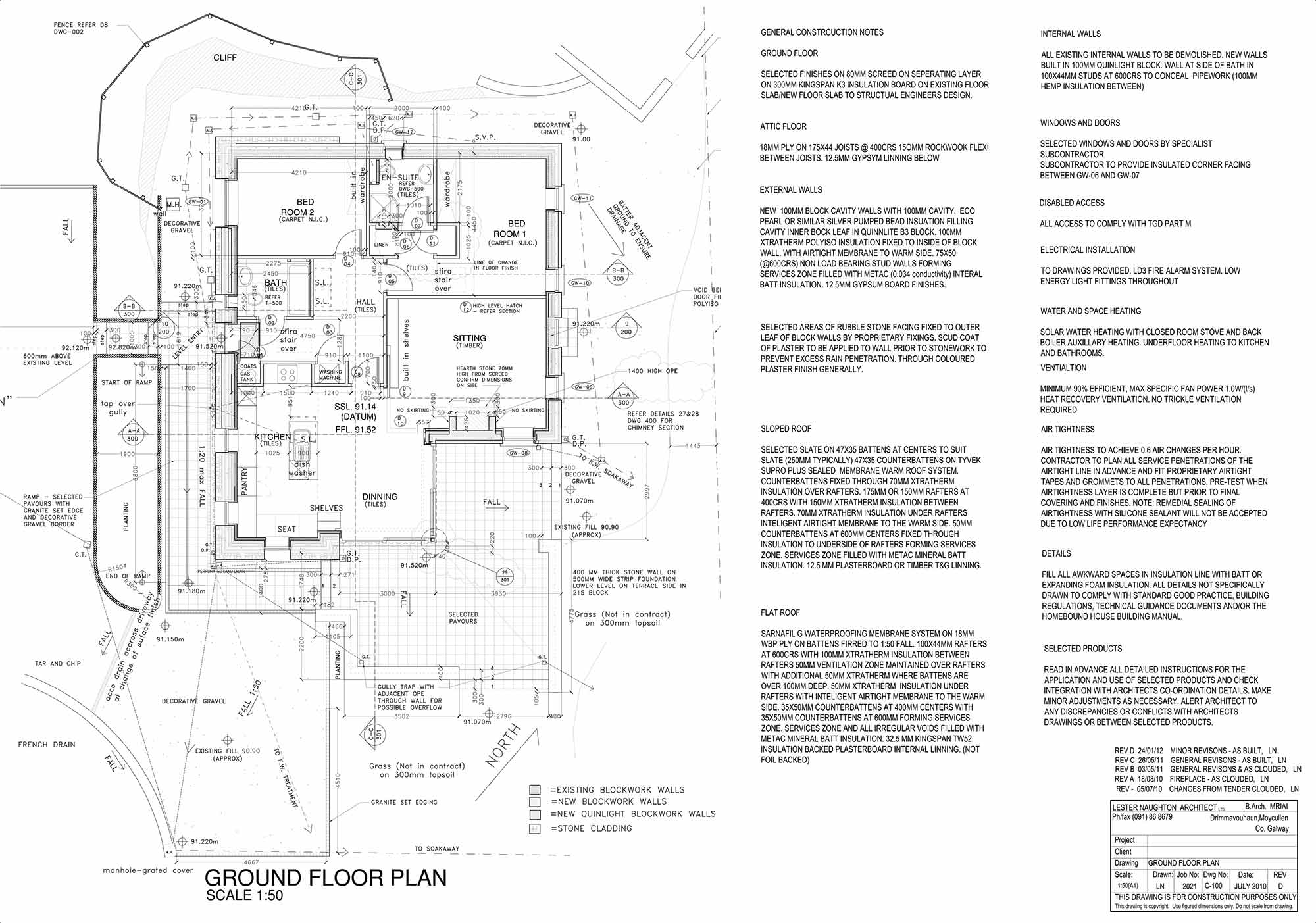 Walls: 200mm stone or plaster finish externally on 100mm concrete block wall with 100mm blown (grey) bead insulation to cavity, 100mm Quinn-lite B3 block interior wall followed by 100mm Xtratherm Thin-R PIR insulation. Isover Vario airtighness/vapour control layer followed by 75mm deep battened wall services zone filled with Isover Metac mineral batt Insulation. Plasterboard and gypsum skim finish. U-value 0.093 W/m2K