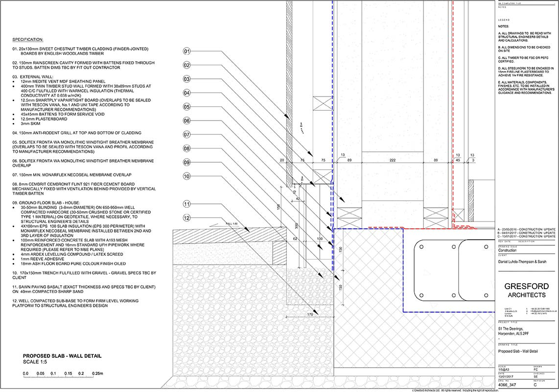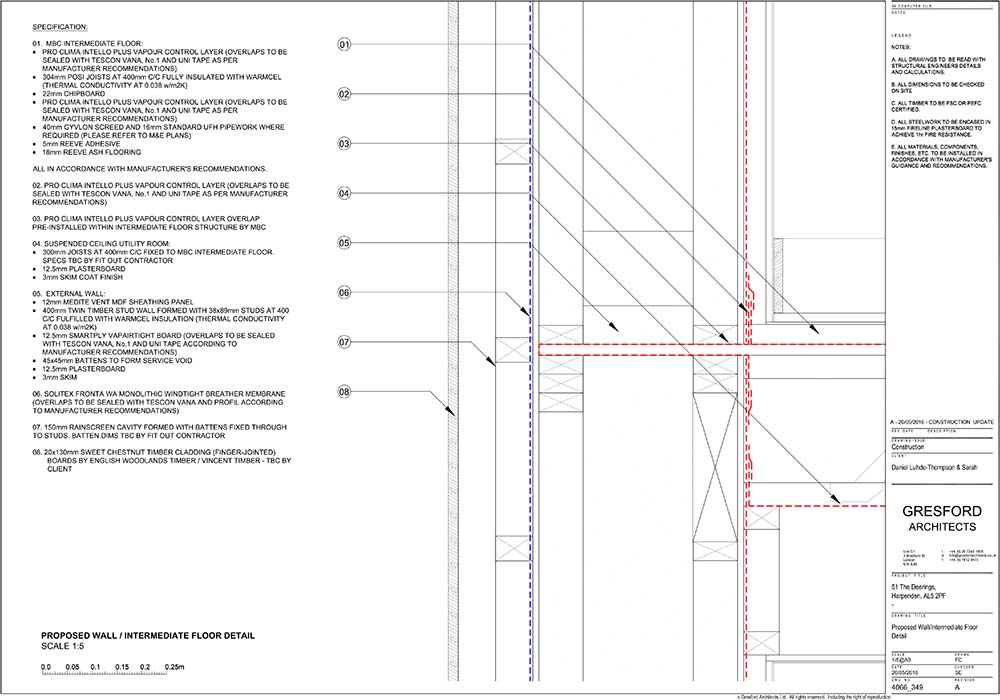 Walls: 20mm sweet chestnut timber cladding externally, followed inside by 150mm rainscreen cavity formed with timber battens, Solitex Fronta WA monolithic wind tight breather membrane, 12mm Medite vent MDF sheathing panel, 400mm twin timber stud wall formed with 38x89mm studs at 400 c/c fulfilled with Warmcel insulation (thermal conductivity at 0.038 W/m2K), 12.5mm SmartPly ProPassiv board, 45x45mm battens to form service void, 12.5mm Plasterboard, 3mm painted skim. U-value: 0.107 W/m2K