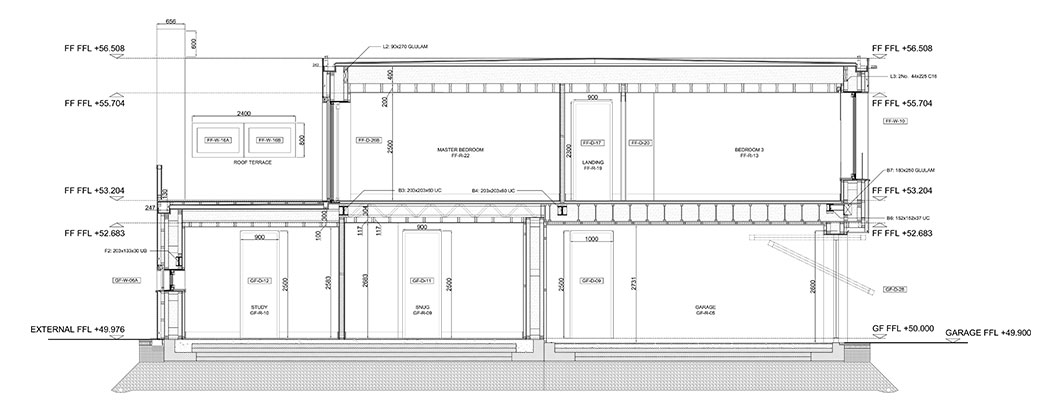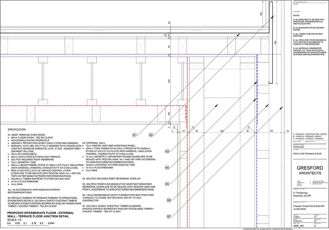 Terrace: 20mm external floor finish, followed underneath by plastic pedestal, Sarnafil protection sheet, Sarnafil G 410-18EL Felt (1.8mm) fully bonded to 18mm plywood, 95x50mm ventilated timber battens and timber firrings fixed through to joists, Solitex Weldano roof membrane, 15mm Smartply OSB, 300mm I-Beam timber joists at 400mm c/c fully insulated with Warmcel insulation (thermal conductivity at 0.038 W/m2K), ProClima Intello Plus vapour control layer, 100x45mm timber battens to form ceiling void, 12.5mm plasterboard, 3mm painted skim. U-value 0.130 W/m2K