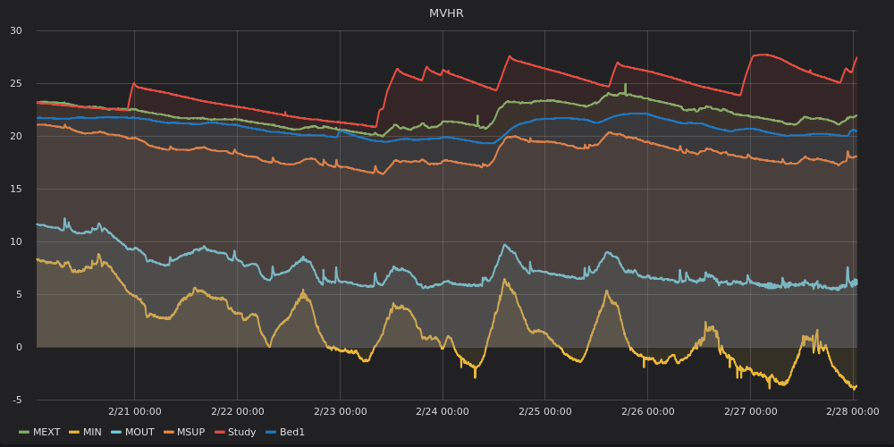 (above) Performance of the house during a week of very cold weather between 21 and 28 February 2018. MIN shows the temperature of air being drawn in from outside by the ventilation system (MVHR) — essentially ambient outdoor temperature. MSUP is the temperature of pre-heated warm air the MVHR is supplying to the house. MEXT shows the temperature of air the MVHR is extracting from ‘wet’ rooms. Bed1 shows the temperature in one bedroom wall, while Study is the temperature in the floor of the study — with spikes when the underfloor heating is turned on. The sensors show consistent, comfortable temperatures during an intense cold spell. MOUT, the red line, shows the temperature of air the MVHR is dumping outside after heating is extracted.