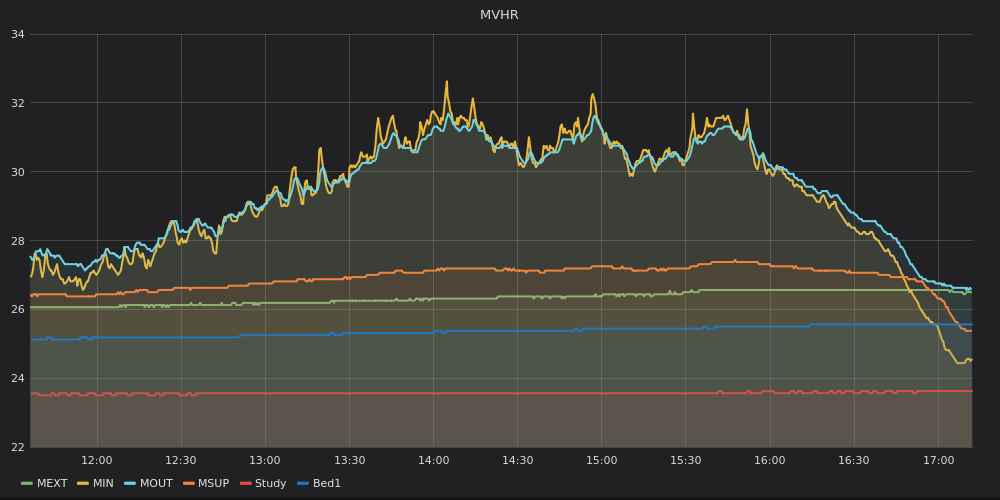 (above) Performance during a remarkably hot summer afternoon, when the temperature of air drawn in by the MVHR (MIN), ie ambient outdoor air, peaked over 32C. MOUT, the temperature of air being dumped outside by the MVHR, tracks this closely, because the heat recovery function is turned off so no heat is being extracted from outgoing air. Temperatures in the study floor (Study) remain below 24C here, but in the bedroom wall (Bed1) they peak slightly over 25C — the passive house definition of overheating. MEXT shows the temperature of air the ventilation system is extracting from wet rooms — again showing signs of some overheating, though temperatures may be warmer in the ventilation duct. MSUP is the temperature of air the MVHR, in bypass mode, is supplying to the house.