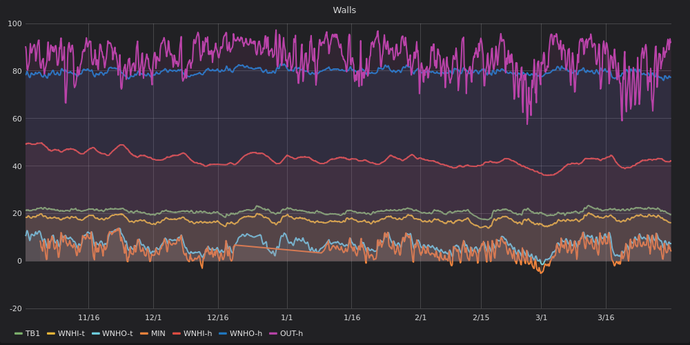 (above) This graph shows temperature and humidity in one external wall between 16 January and 16 March. MIN show the temperature of outdoor air drawn in by the MVHR. WNHO-t is ‘wall north high outside temperature’, the temperature of an in-wall sensor high on the outside of a north-facing wall, so it closely tracks ambient temperature. WNHI-t is towards the inside of the same wall, with a temperature consistently around or just under 20C. WNHI-h shows humidity on the same sensor, consistently between the 40% and 60% recommended for good indoor air quality. WNHO-h shows humidity towards the outside of this wall, typically around 80%, while OUT-h shows ambient outdoor humidity. Overall the graph reveals a healthy, consistent indoor humidity in spite of humid conditions outside. TB1 is the bedroom temperature, consistently at or just above 20C.