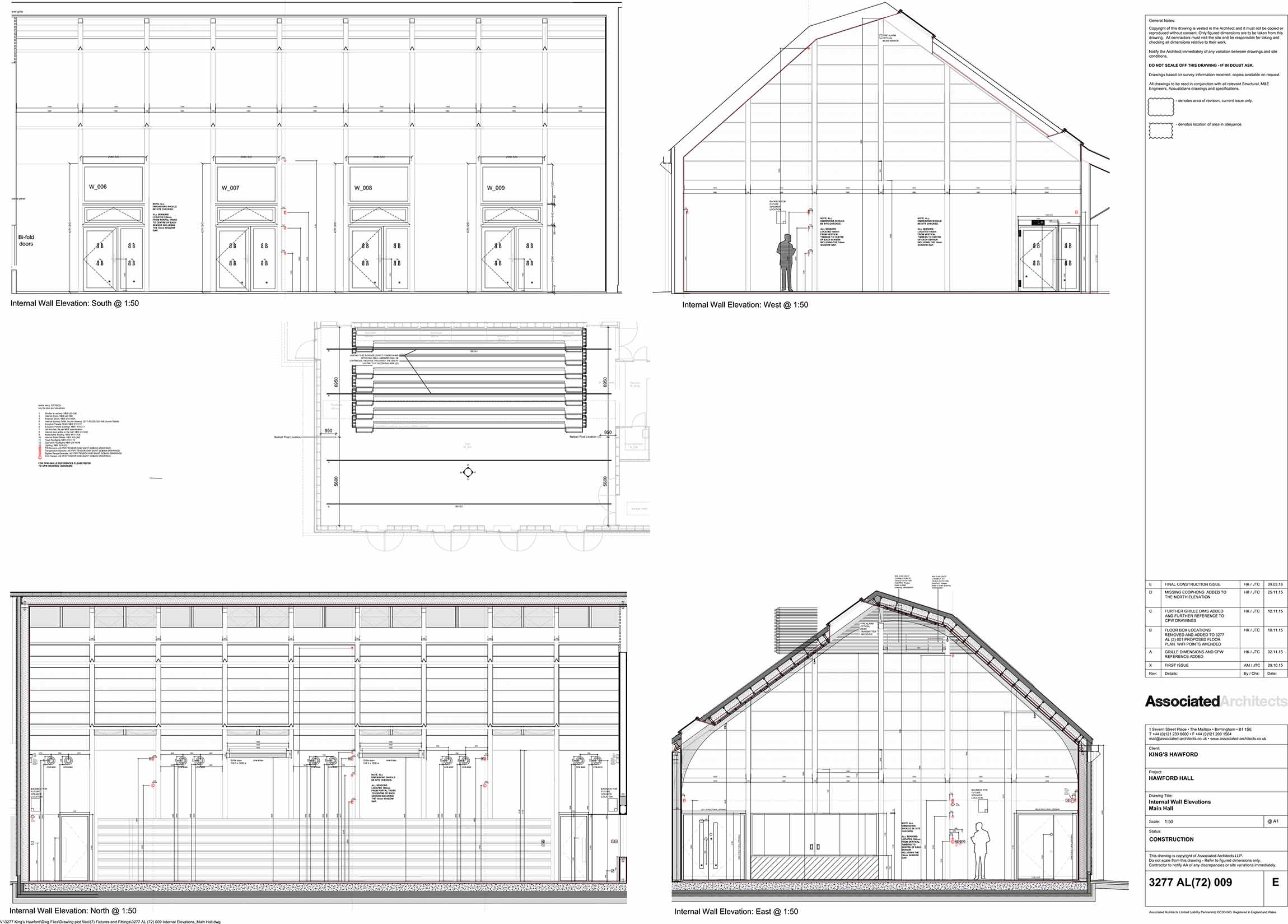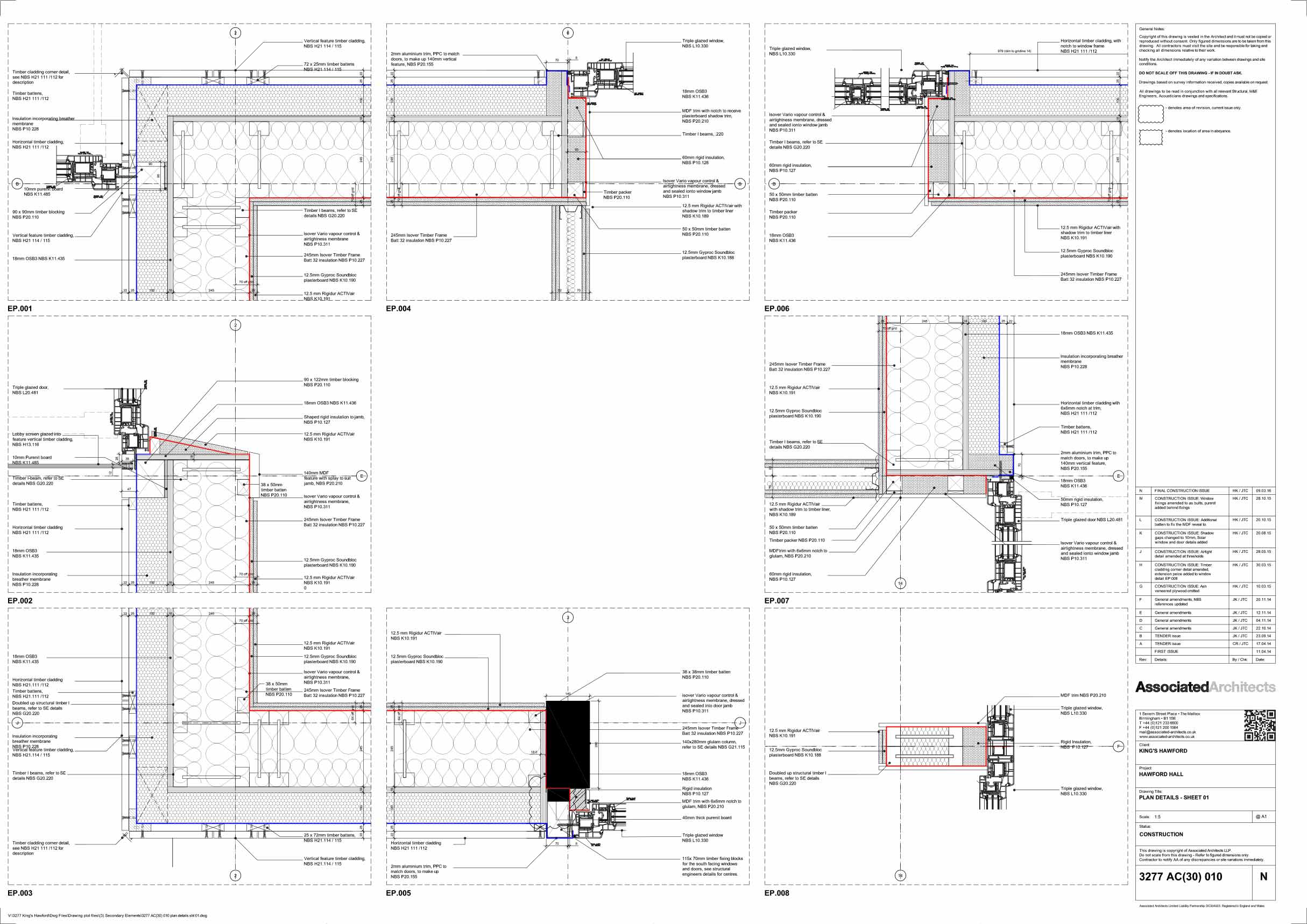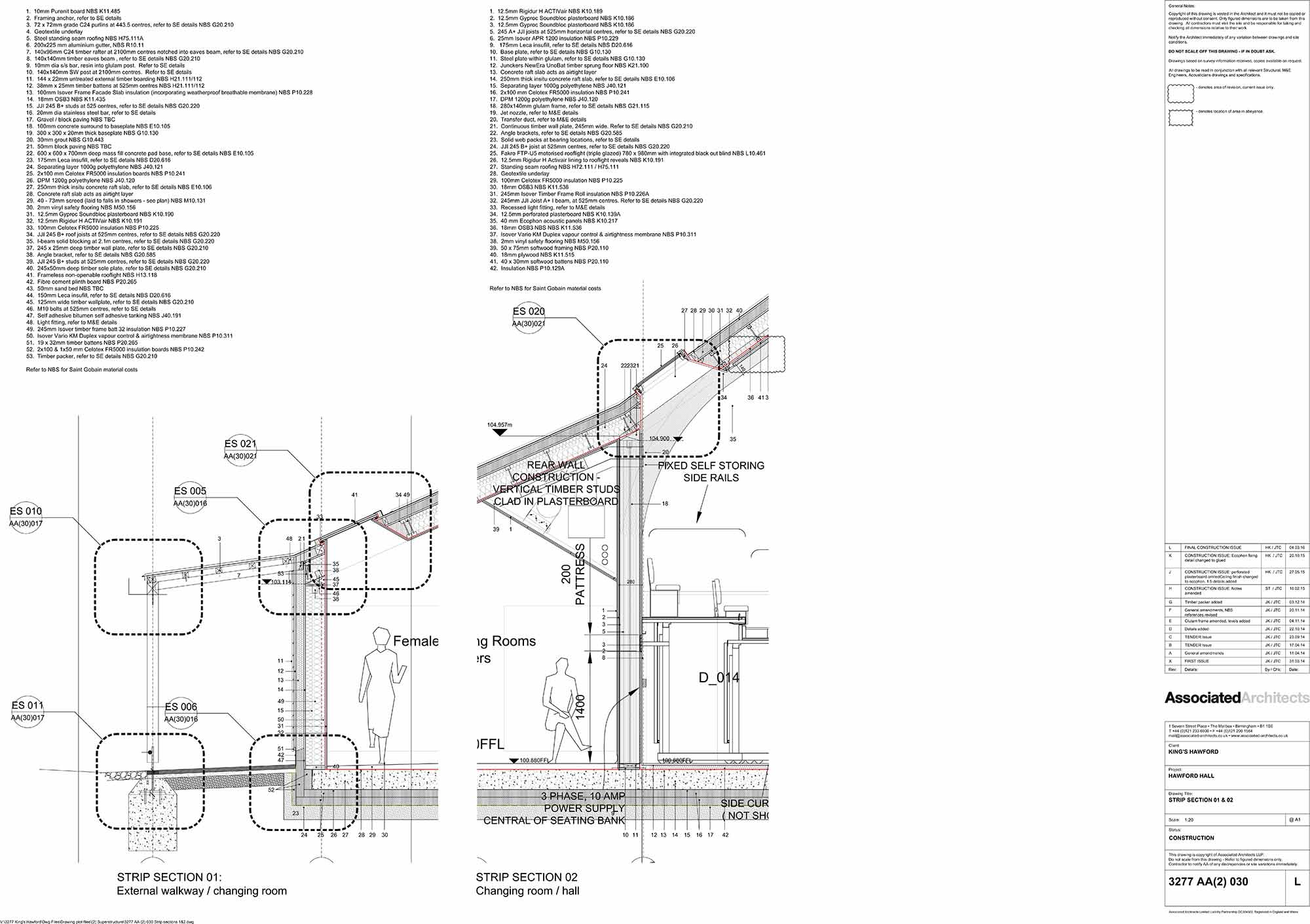 Walls: 144 x 22mm untreated external oak rainscreen boarding, International Timber, with recessed allen head stainless steel slotted connectors to 38 x 25mm softwood battens at 525mm vertical centres, over 100mm thick Isover Frame Façade Slab insulation (incorporating weatherproof breathable membrane), over 18mm OSB3 board for racking rigidity, over 245mm JJI joist B+ I-beam at 525mm centres. 245mm Isover Timber Frame Batt 32 insulation with an Isover Vario KM Duplex vapour control and airtightness membrane. (In Sports hall only, glulam portal trusses sitting flush with the wall separated by 6mm shadow gaps either side). Internal lining: 12.5mm British Gyproc Soundbloc plasterboard plus 12.5mm Rigidur H Activair gypsum fibreboard lining. Locally Ecophon Akusto Wall C robust acoustic panels. U-value: 0.082 W/m2K