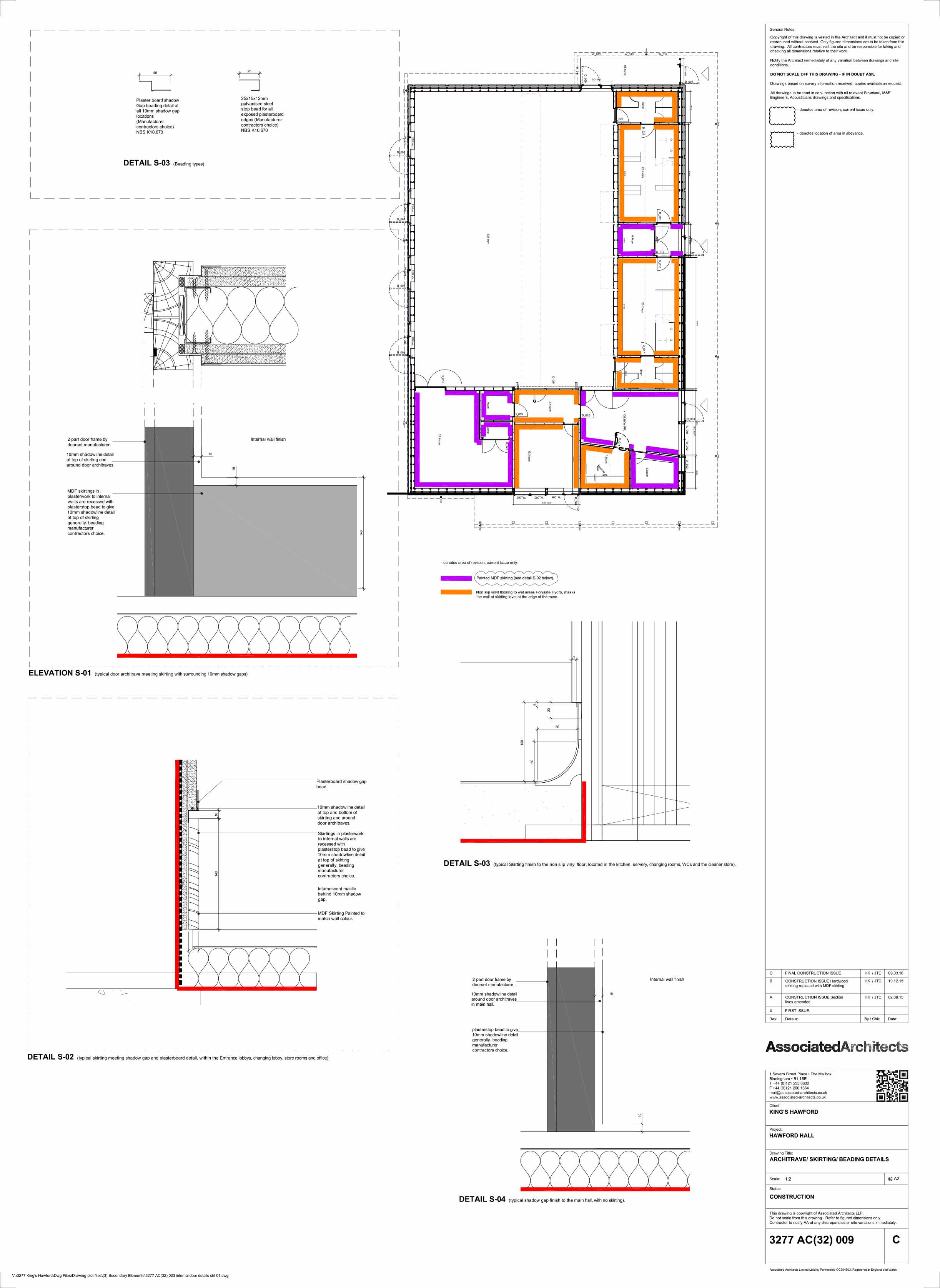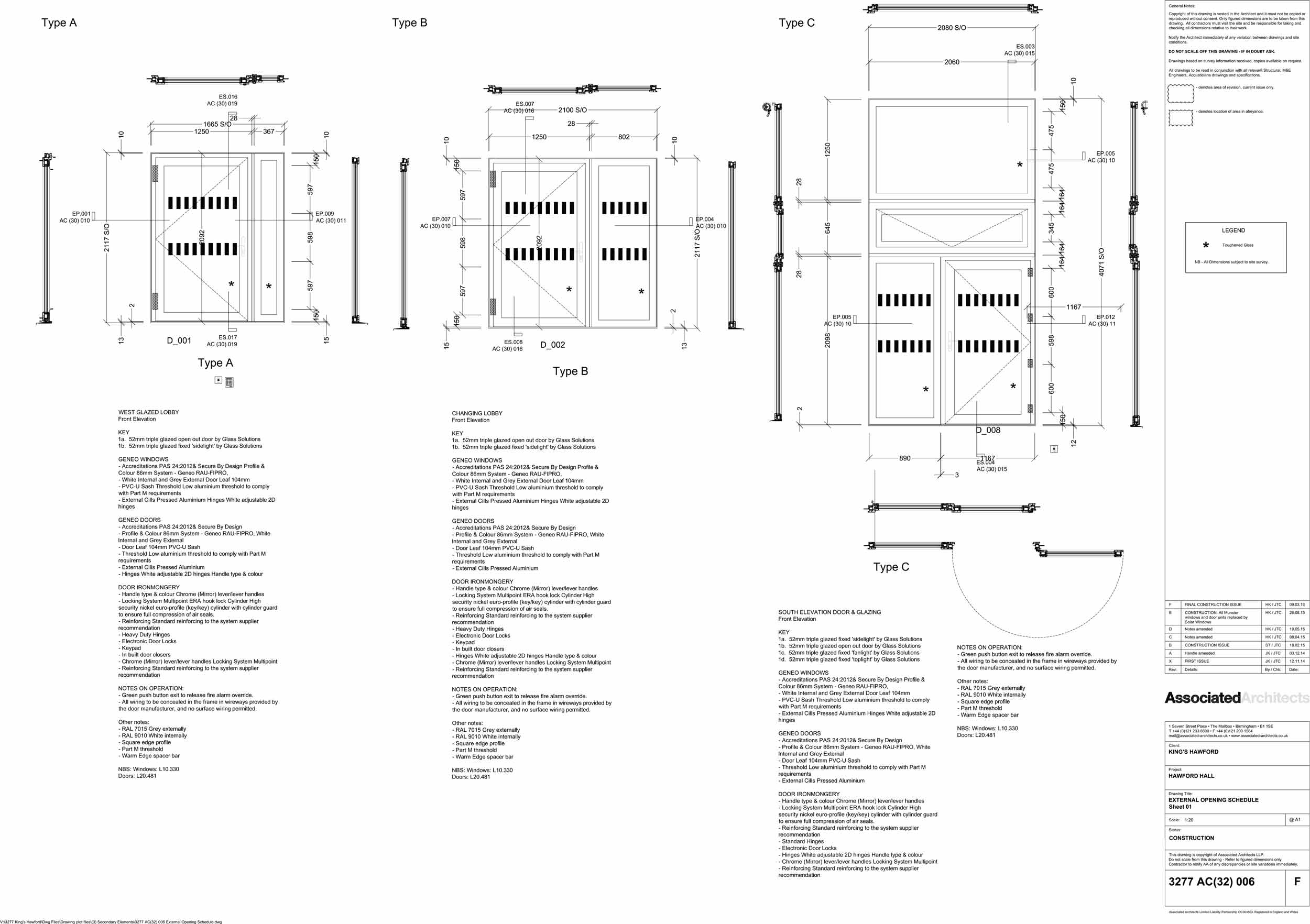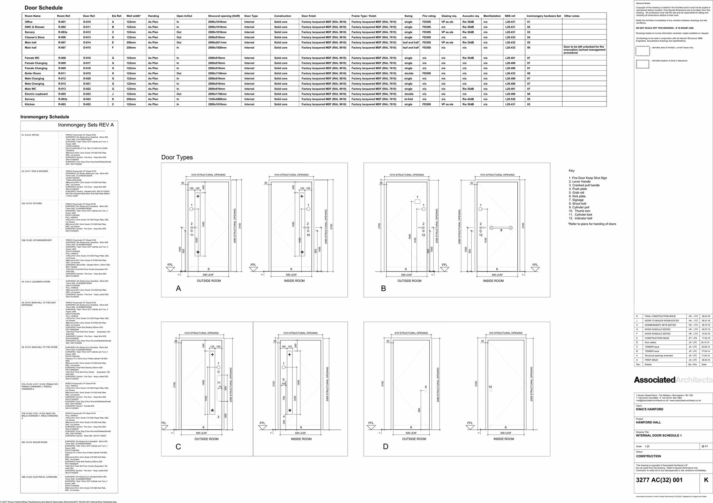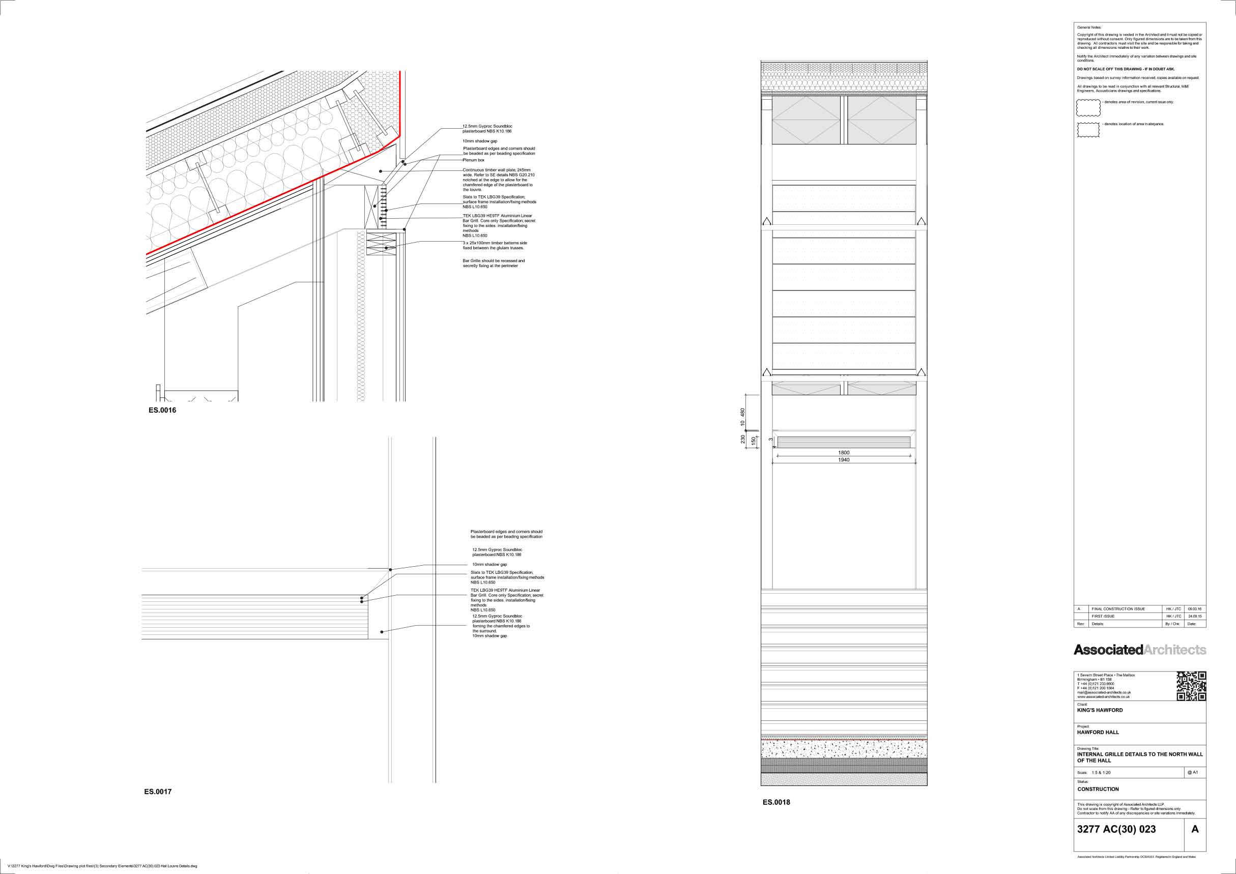 Walls: 144 x 22mm untreated external oak rainscreen boarding, International Timber, with recessed allen head stainless steel slotted connectors to 38 x 25mm softwood battens at 525mm vertical centres, over 100mm thick Isover Frame Façade Slab insulation (incorporating weatherproof breathable membrane), over 18mm OSB3 board for racking rigidity, over 245mm JJI joist B+ I-beam at 525mm centres. 245mm Isover Timber Frame Batt 32 insulation with an Isover Vario KM Duplex vapour control and airtightness membrane. (In Sports hall only, glulam portal trusses sitting flush with the wall separated by 6mm shadow gaps either side). Internal lining: 12.5mm British Gyproc Soundbloc plasterboard plus 12.5mm Rigidur H Activair gypsum fibreboard lining. Locally Ecophon Akusto Wall C robust acoustic panels. U-value: 0.082 W/m2K