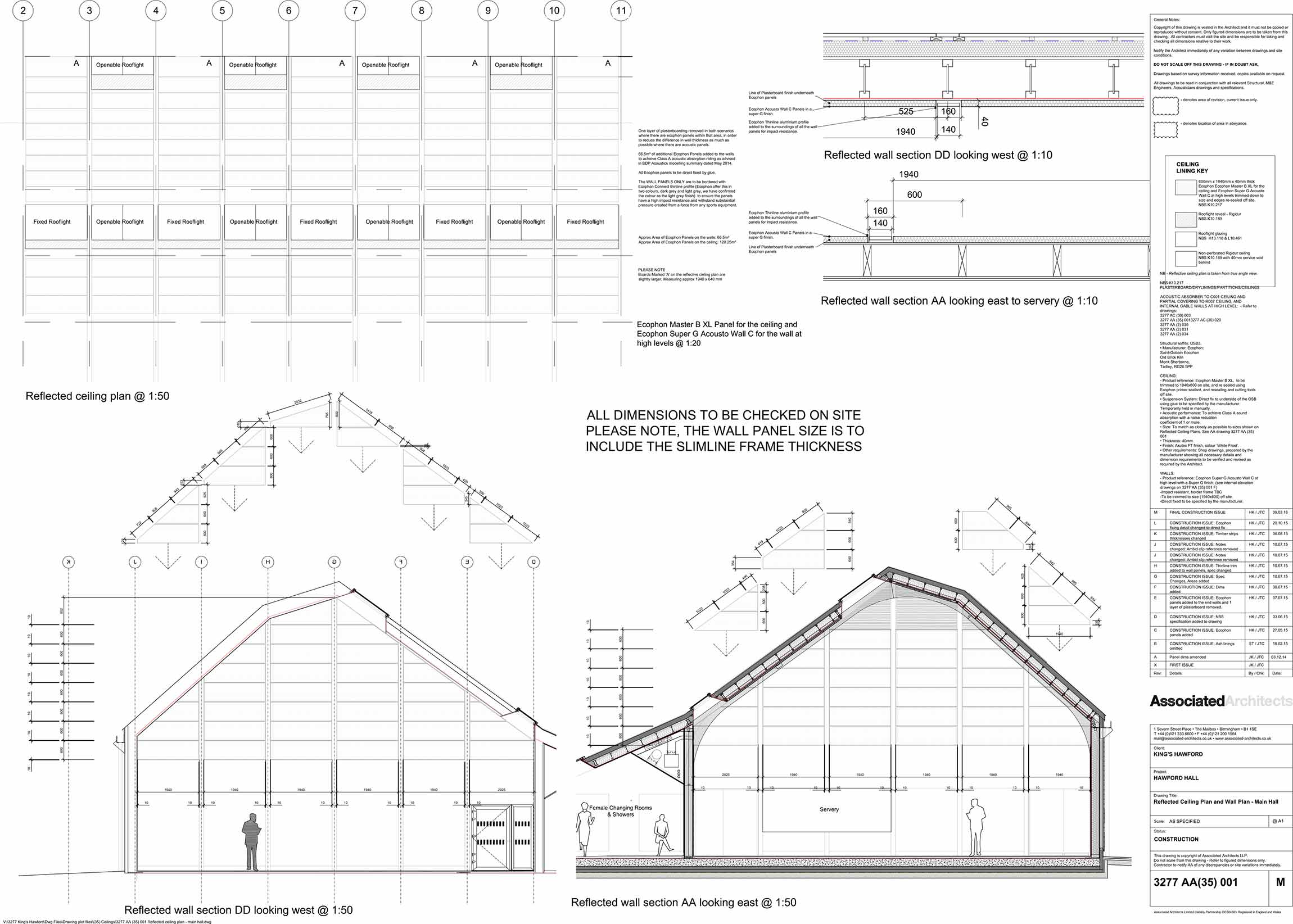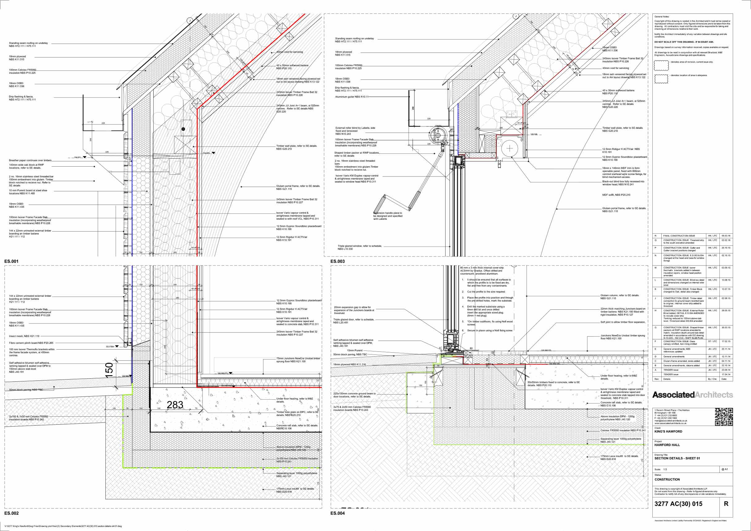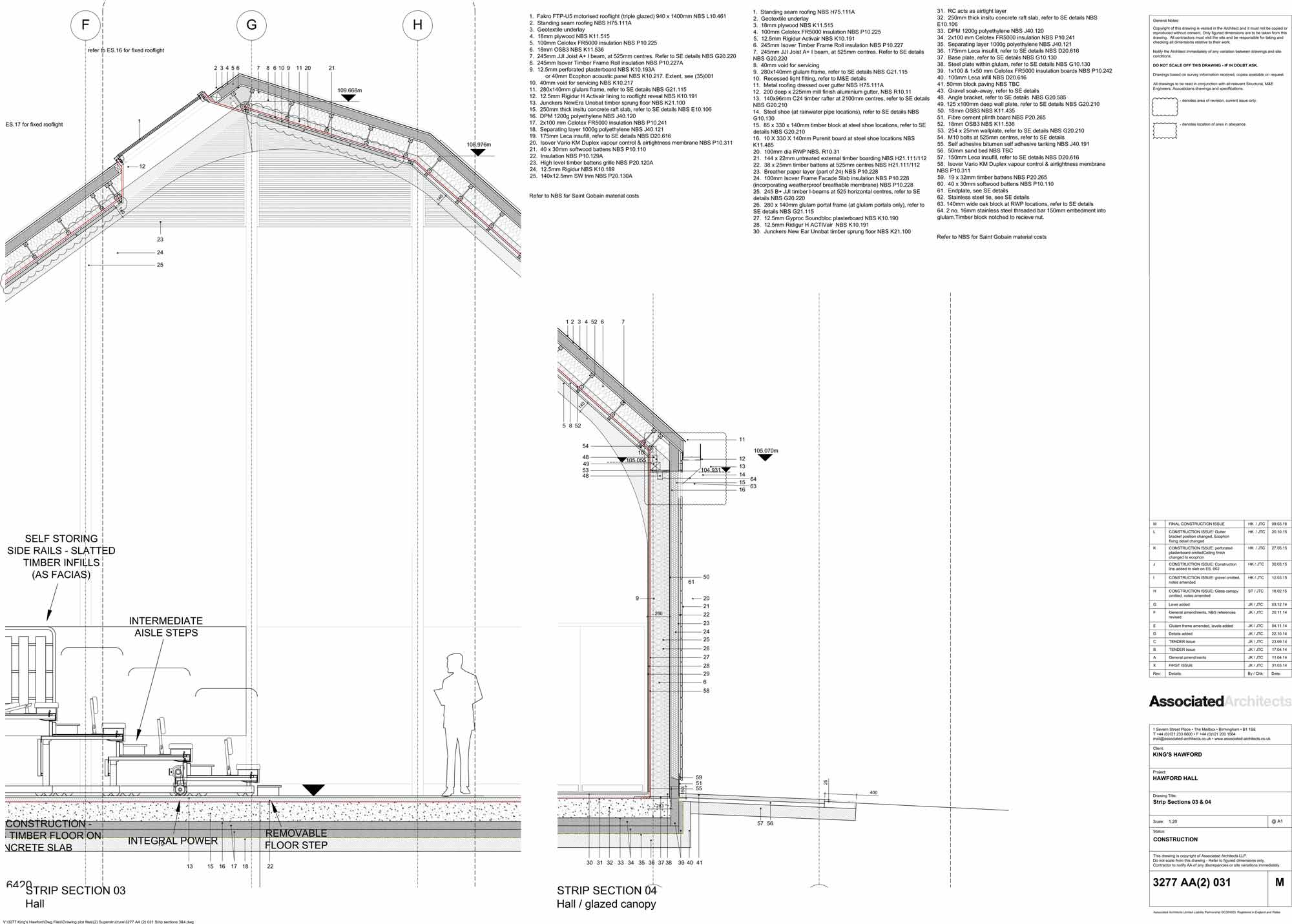 Roof: Follansbee KlassicKolors Standing Seam roofing system on Geotextile underlay, on 18mm OSB3 board, on 100mm Celotex FR5000 Insulation, on 18mm OSB3 Board, on 245mm JJI Joist A+ I-beam at 525mm centres. 245mm Isover Timber Frame Batt 32 insulation and Isover Vario KM Duplex vapour control and airtightness membrane, (in the sports hall only, glulam portal truss, set partially into the I-beam zone). Internal lining: 18mm OSB3 board with 40mm thick Ecophon Master SQ XL acoustic panels fixed direct to OSB. U-value: 0.081 W/m2K
