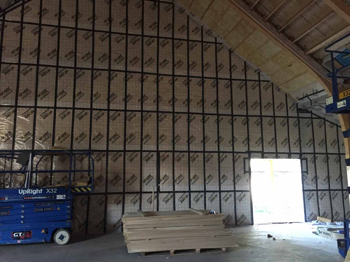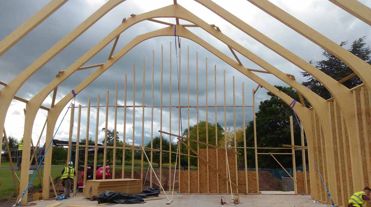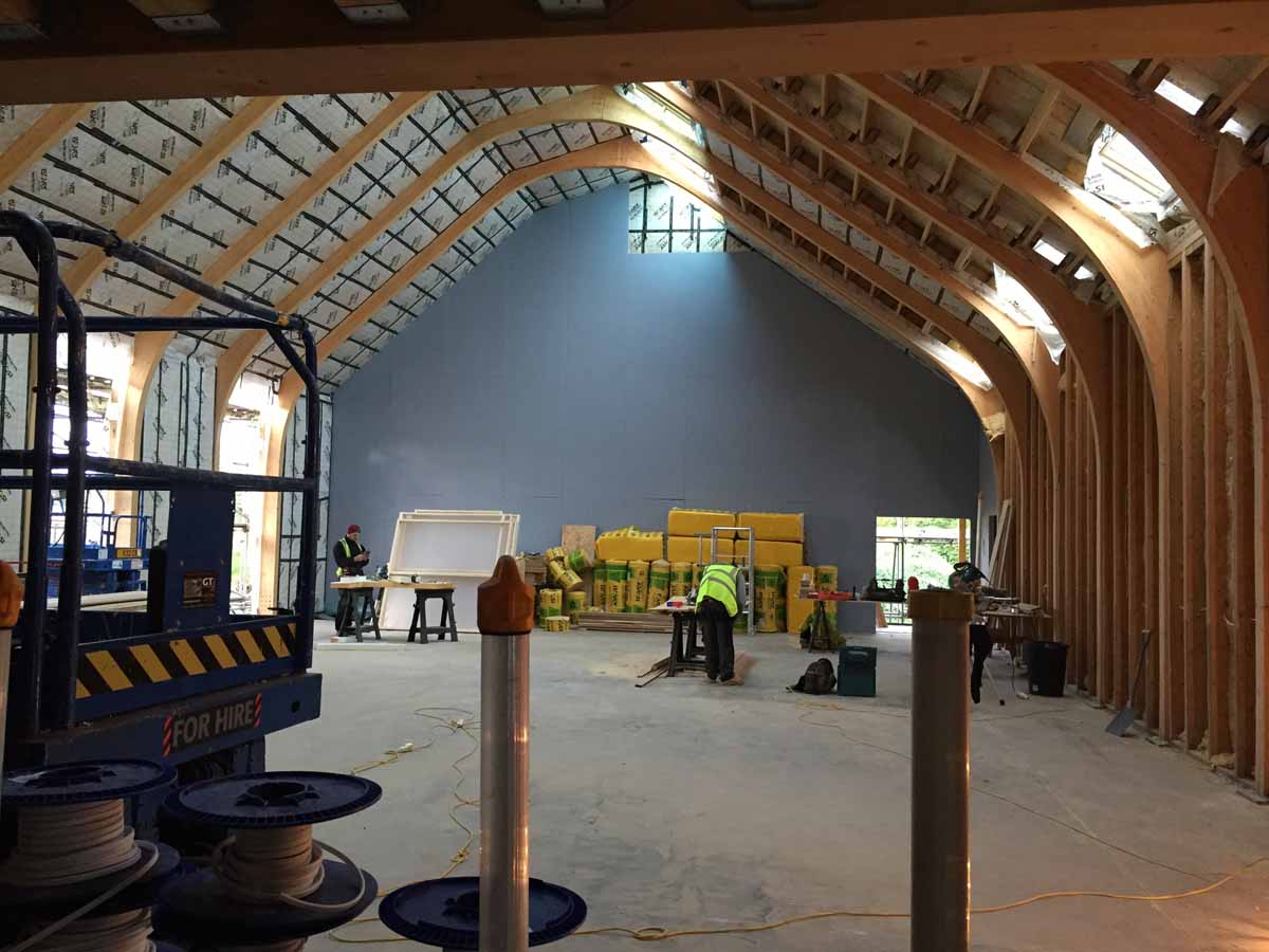 Erection of the timber frame superstructure, the unique shape of which was inspired by the rich historical tradition of vernacular timber framed “cruck” buildings around Worcestershire