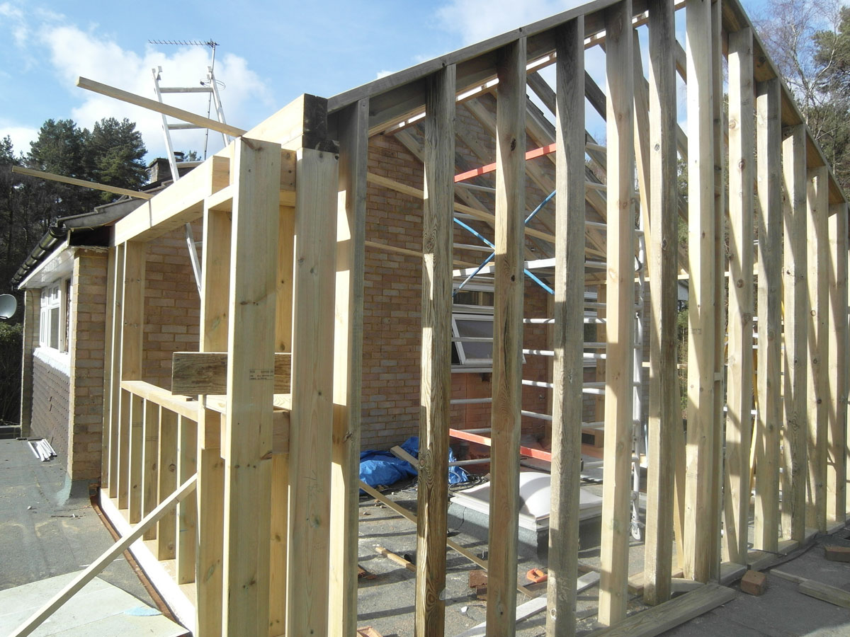 After: New flat roofs to utility area and sunspace extension formed from 200 x 50mm SW, insulated between using 2 layers of 100mm Steico Flex wood fibre, WBP plywood deck and 80mm PUR insulation forming part of mineral felt built up roof system with VCL laid over plywood. Underlined internally with vapour control layer and plasterboard. U-value: 0.131 W/m2K