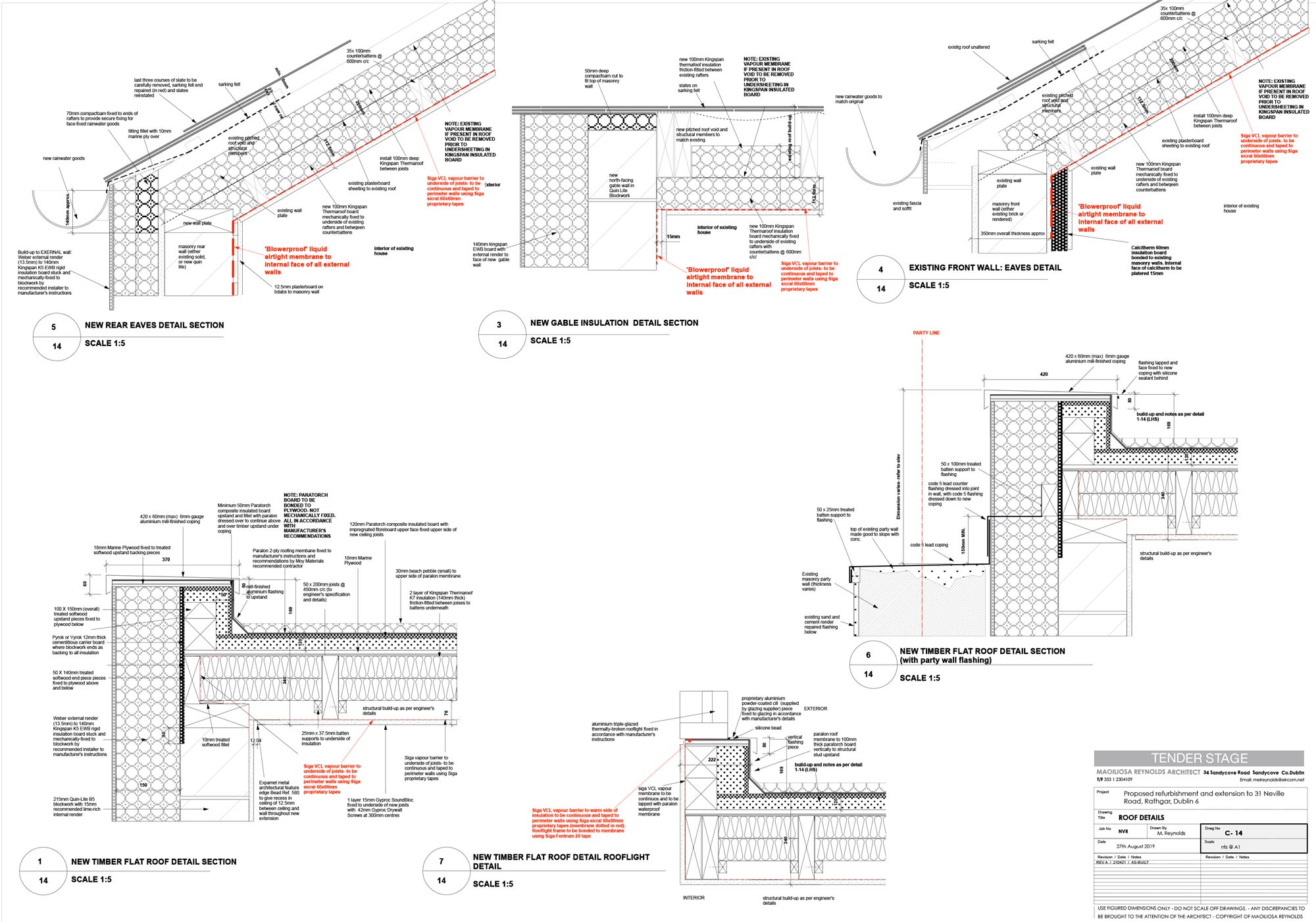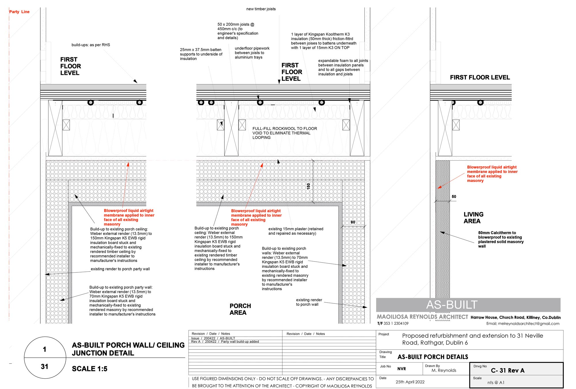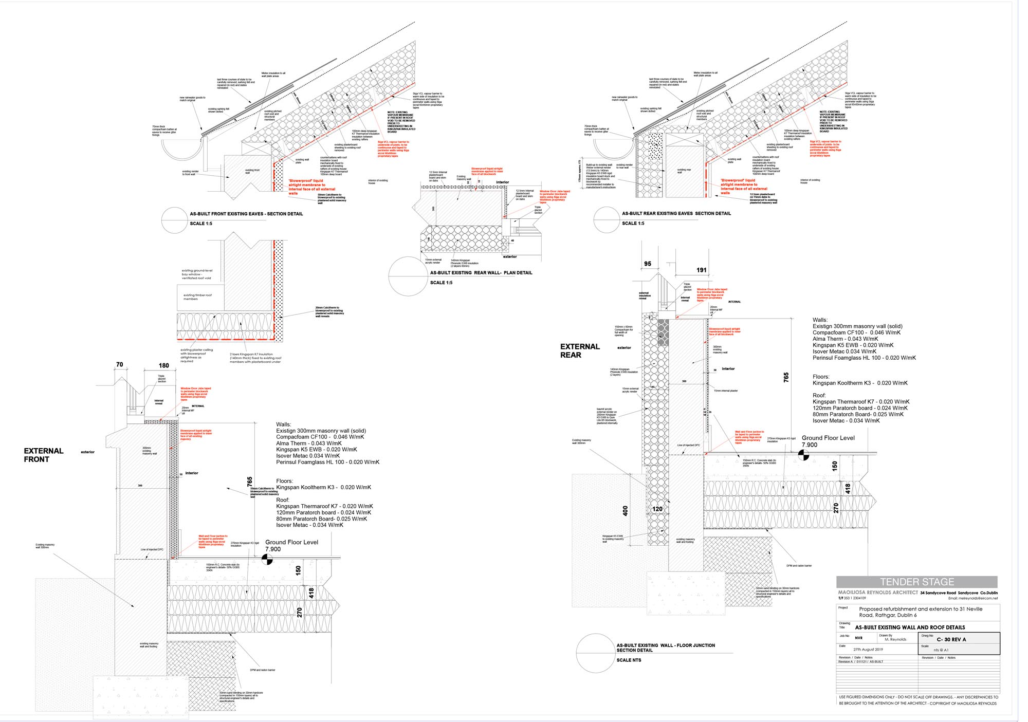 Extension new walls: Acrylic external render to 140 mm Kingspan EWB insulation, to 215 mm Quinn Lite B5 blocks, Blowerproof liquid airtight membrane, 12.5 mm plaster on 15 mm dabs internally. U-value: 0.12 W/m2K