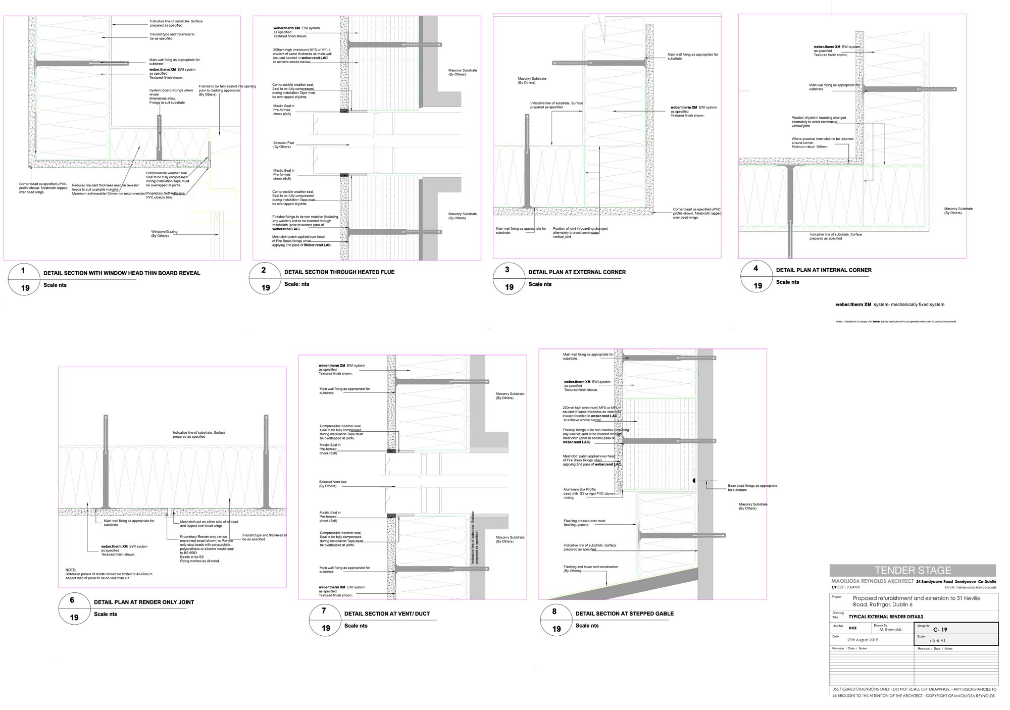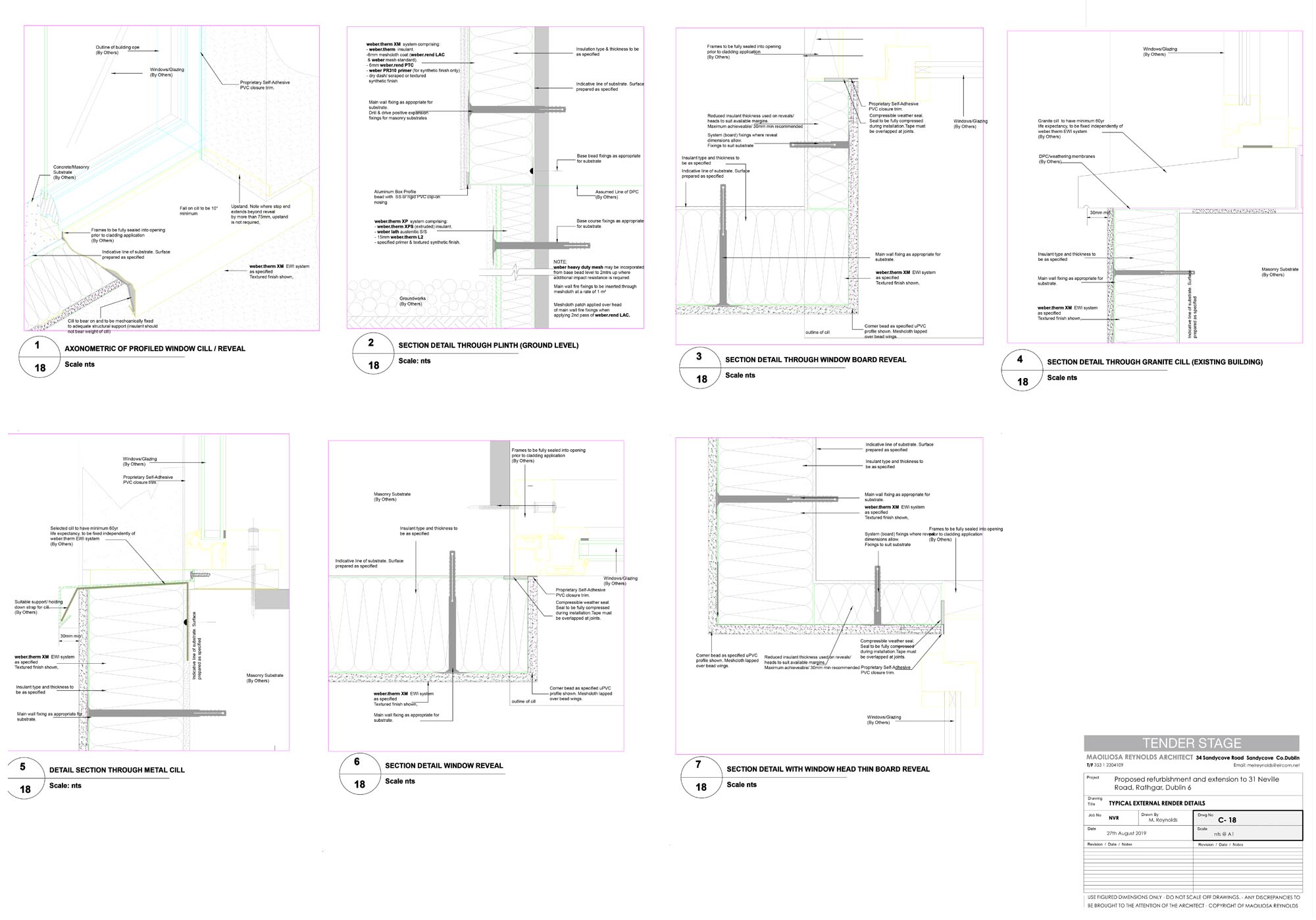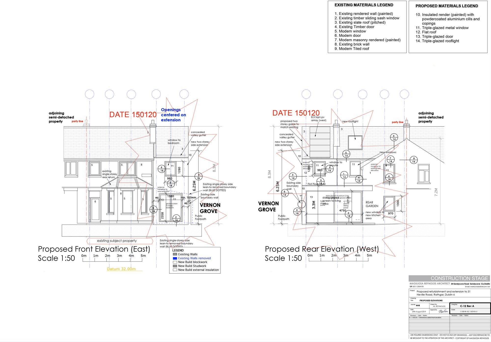 Extension new walls: Acrylic external render to 140 mm Kingspan EWB insulation, to 215 mm Quinn Lite B5 blocks, Blowerproof liquid airtight membrane, 12.5 mm plaster on 15 mm dabs internally. U-value: 0.12 W/m2K