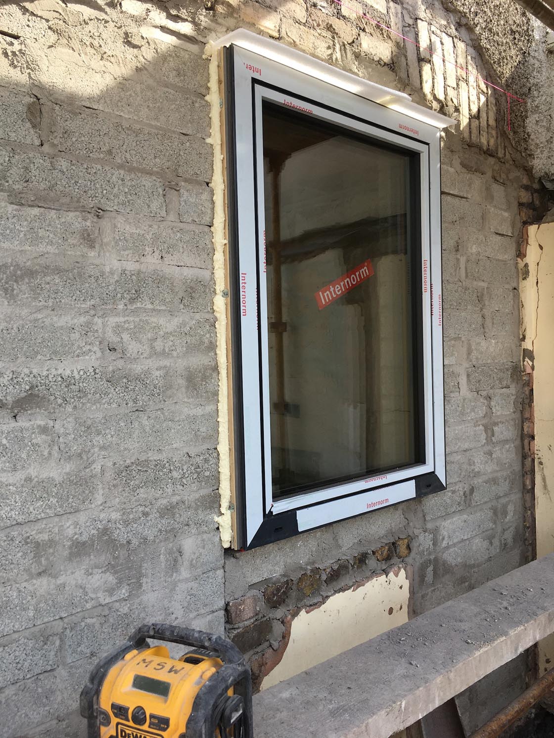 Internorm triple glazed aluminium-clad oak units sitting proud of the blockwork to keep continuity with the external insulation layer