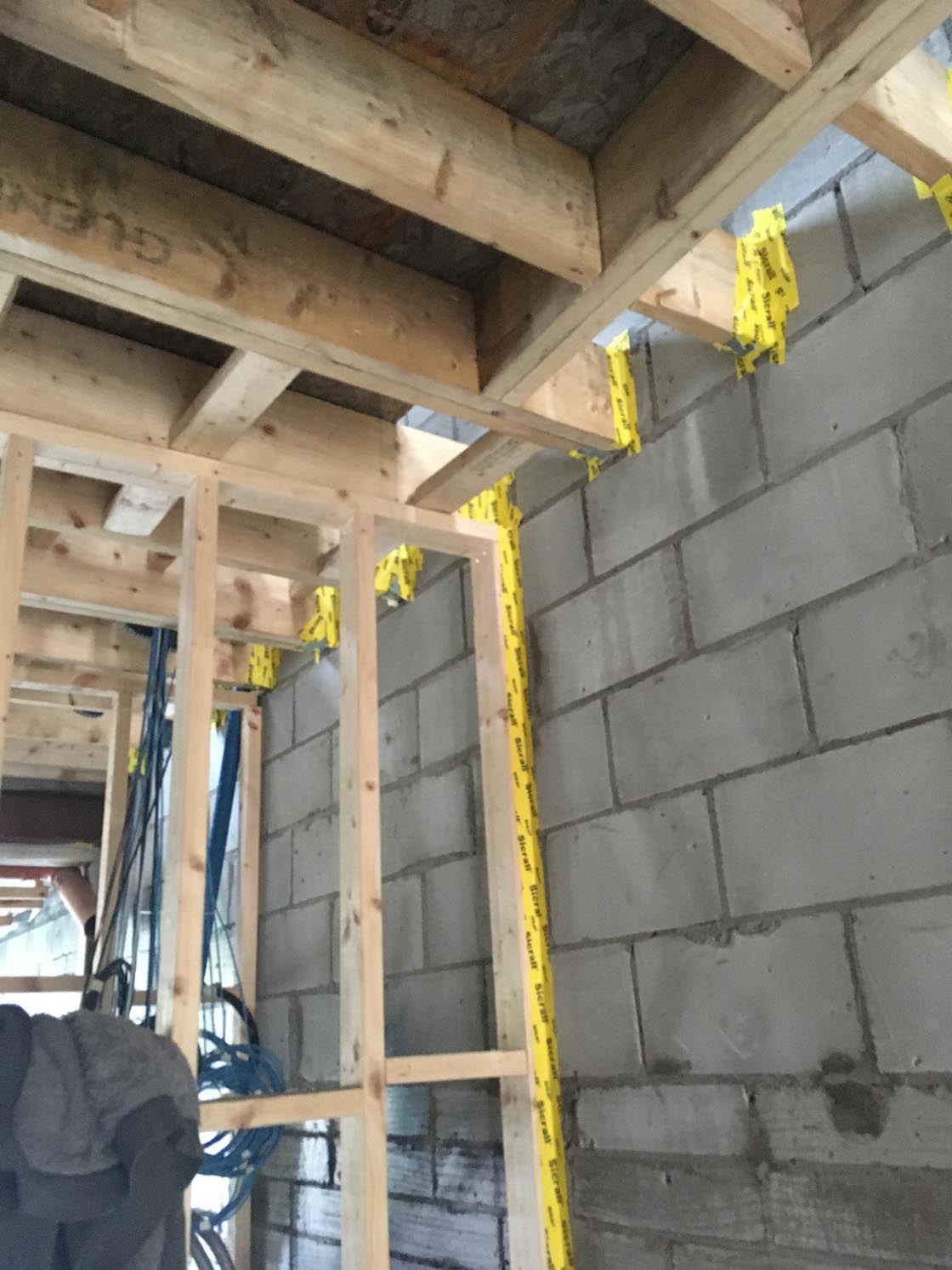 Carefully applied Siga airtight tape seals the joist ends and stud walls to the Mannok blocks