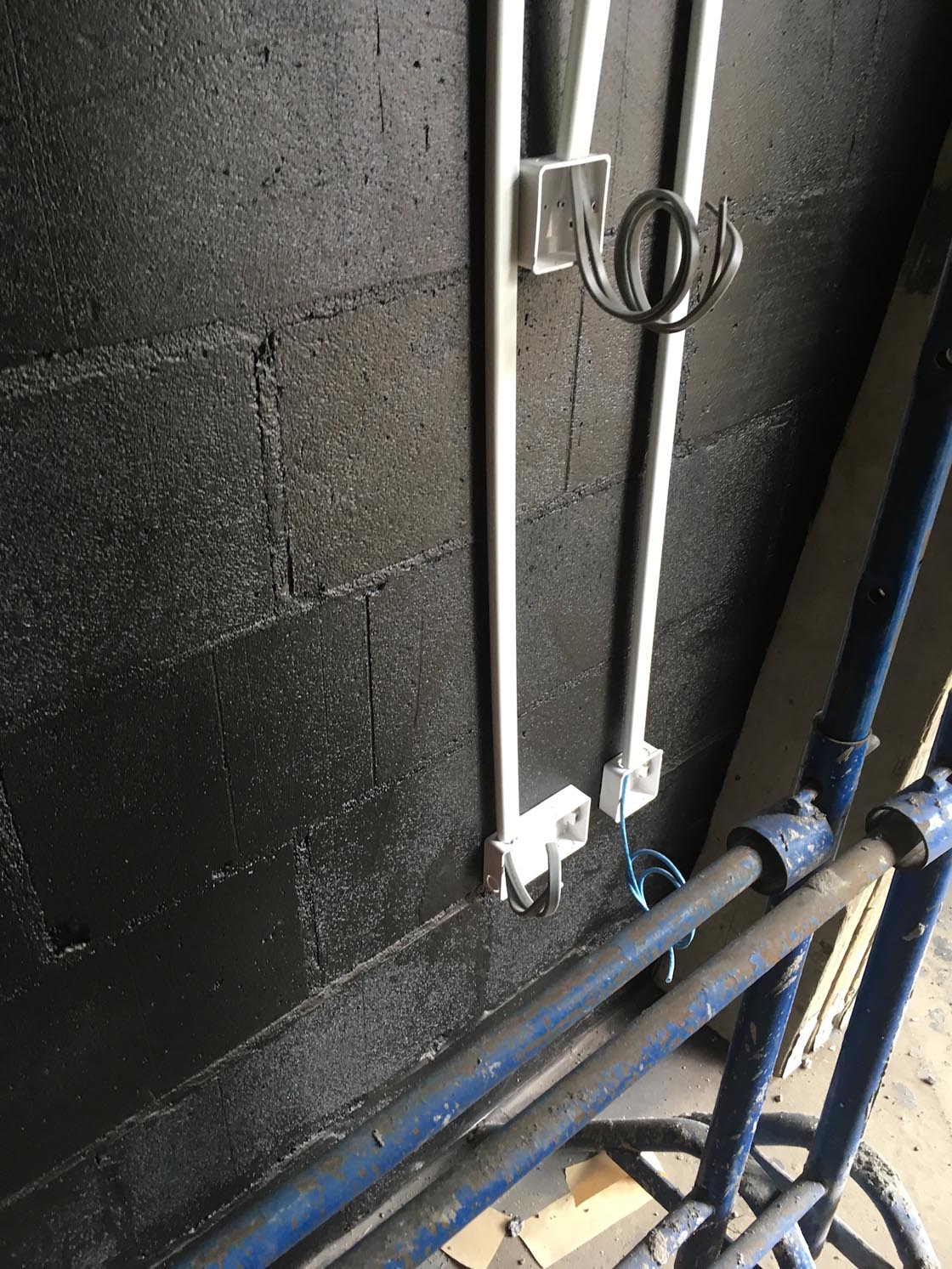Blowerproof to inner surface of Mannok block walls with surface-mounted slimline boxes and conduits – no chasing required before dab and slab applied as internal finish