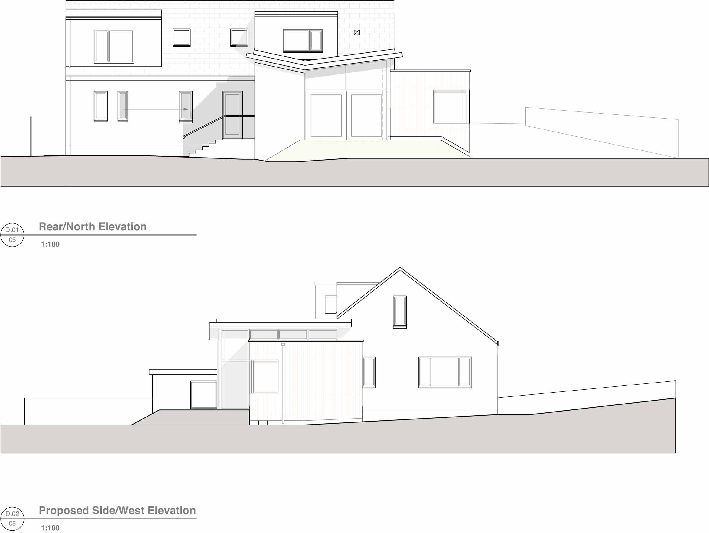 Extension walls 2: Cedar timber cladding externally on treated battens, on breather membrane over 350 mm cavity block wall with 150 mm blown bead insulation (0.031 W/mK) to cavity, internal plaster finish. U-value: 0.17 W/m2K
