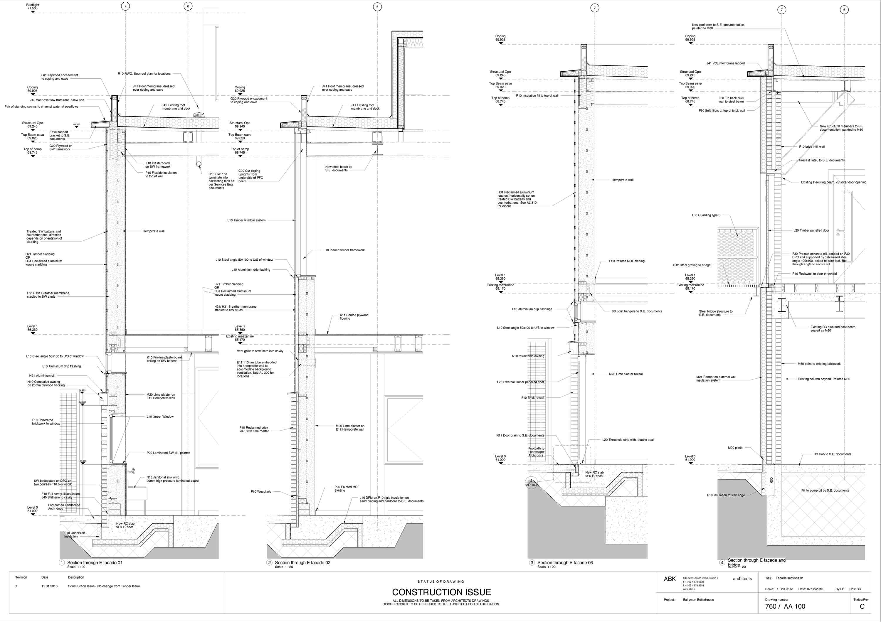 Hempcrete walls: 300mm Hempcrete, followed outside by ventilated cavity and various external rainscreen claddings. U-value: 0.18 W/m2K.