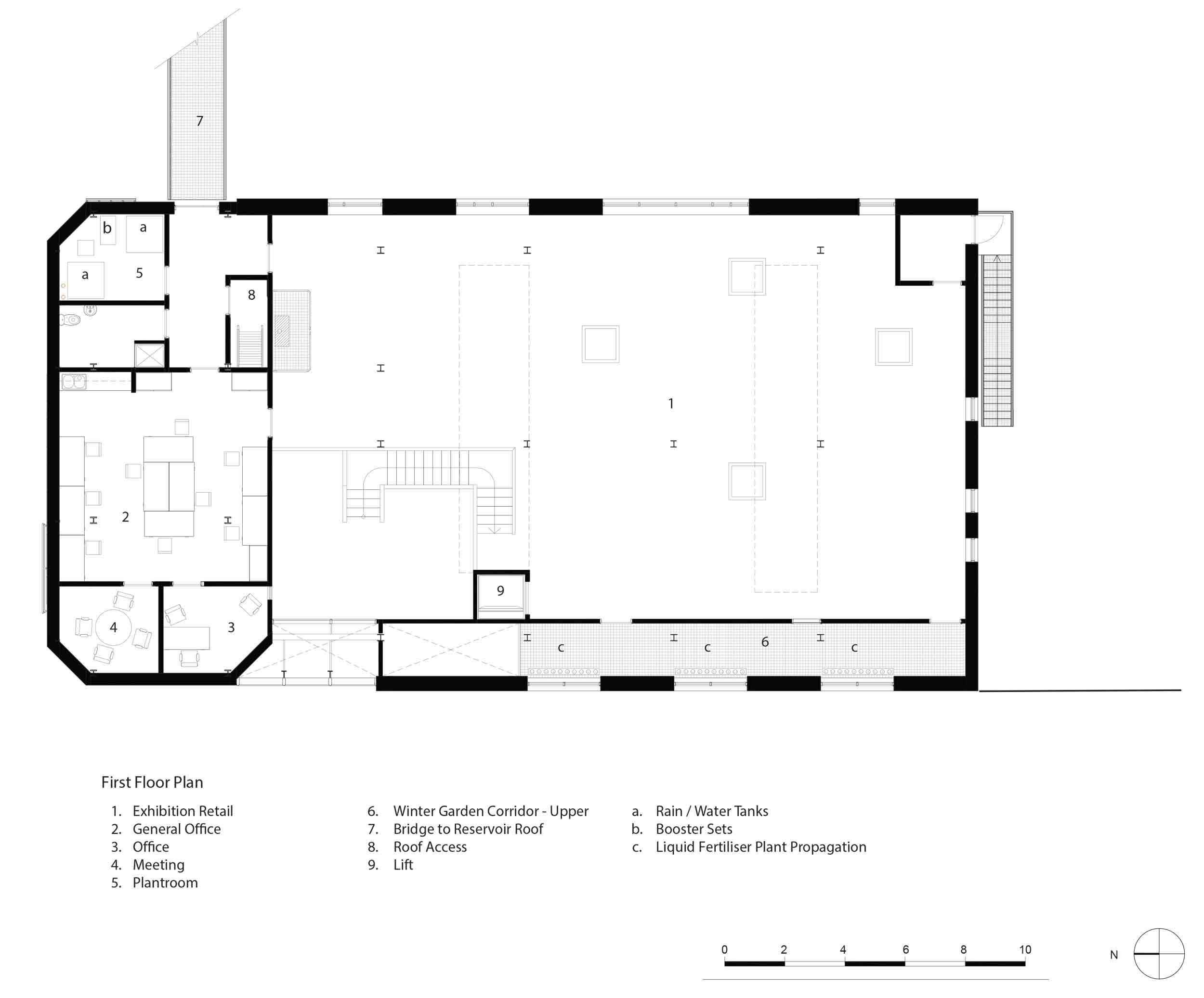 “When we looked closely at the scheme we realised that the top of the buried reservoir on the site was more or less at the floor level we were adding into the building. Originally, there was a notion that we would clear the reservoir to make way for the kitchen garden, but instead, we decided to make a bridge from the new first floor level out to the top of the reservoir.”