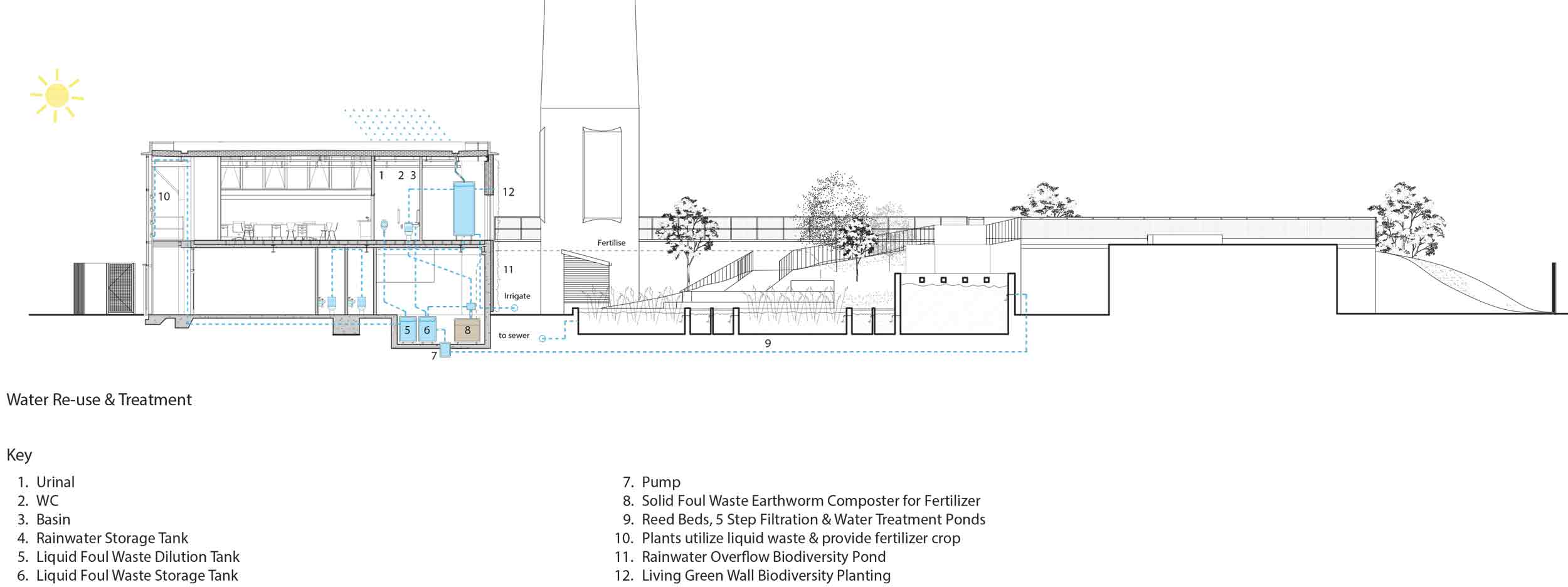 The Rediscovery Centre’s water management and drainage systems were designed to minimise waste water discharge, mains water use and sewage sludge generation. Conversely, the system maximises water recycling and nutrient recovery. In addition to rainwater harvesting from the building roof, the building features waterless urinals and composting toilets which make use of the onsite reed bed system. Urinal waste water is collected and used for plant nutrition in the internal comfrey wall. There is permeable paving and a vertical living wall, as well as green roofs. As with all of the systems in the centre, monitors are installed throughout, in order to keep track of usage and to ensure water quality.