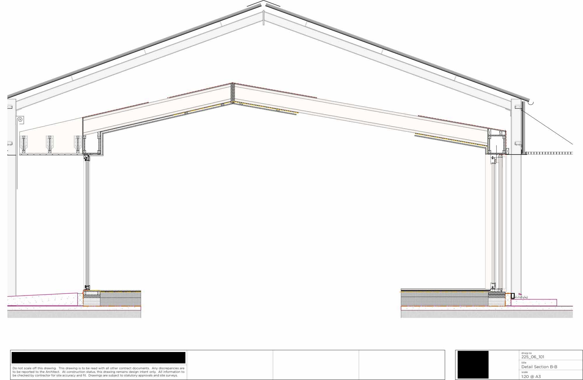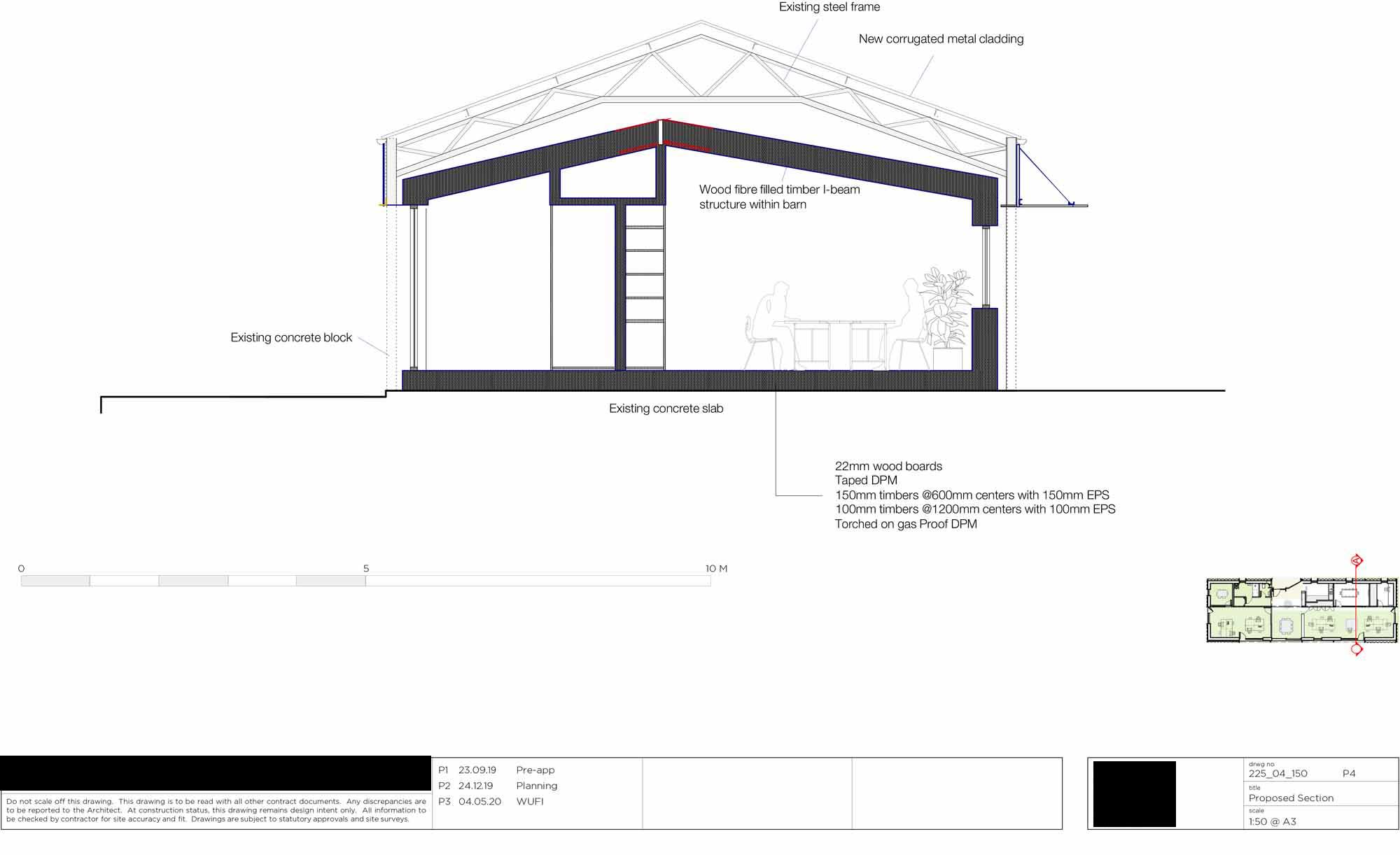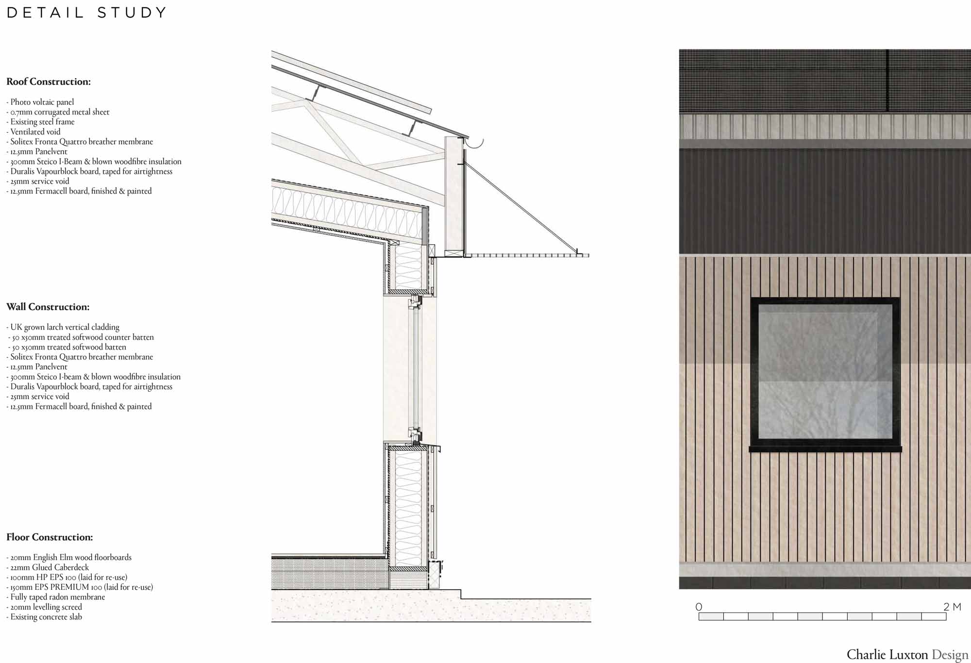 Walls: Polyester powder coated corrugated iron cladding to existing steel frame, followed inside by ventilated cavity, breather membrane, Panelvent breathable sheathing board, Steico I-beam system with 300 mm Steico Zell wood fibre insulation, Durelos Vapourblock airtight vapour control board, 25 mm services zone, Fermacell board. U-value: 0.132 W/m2K